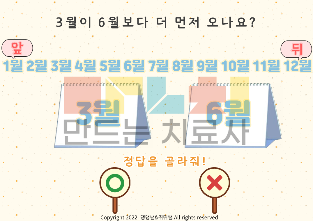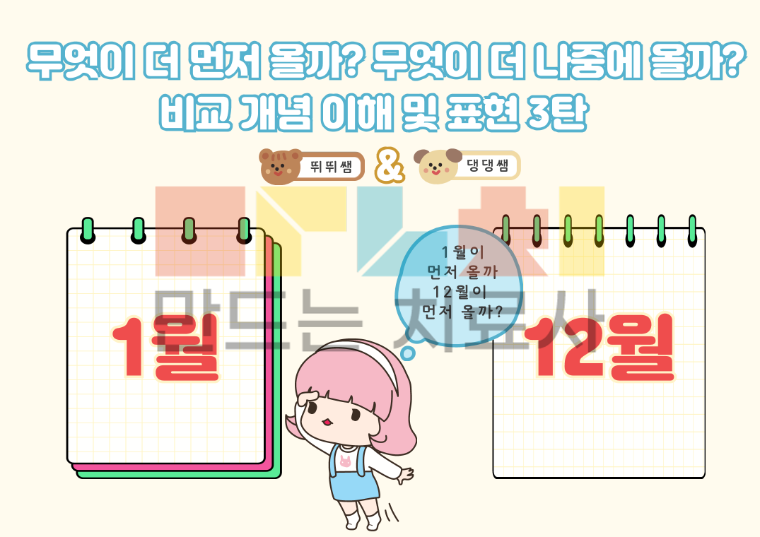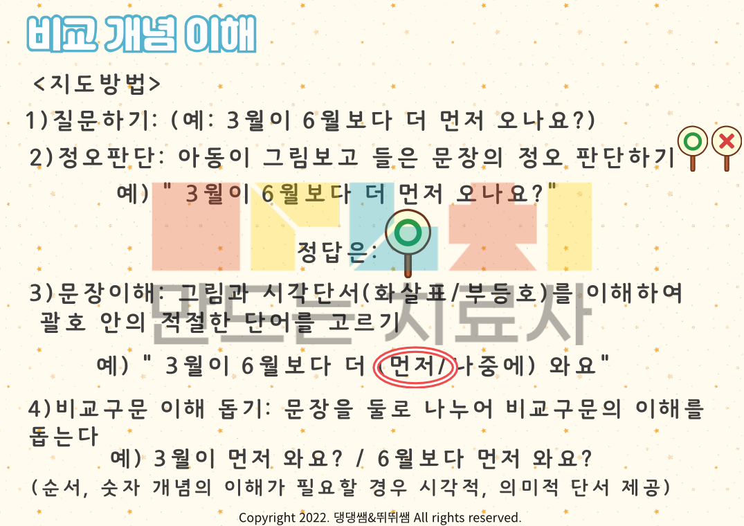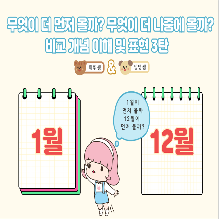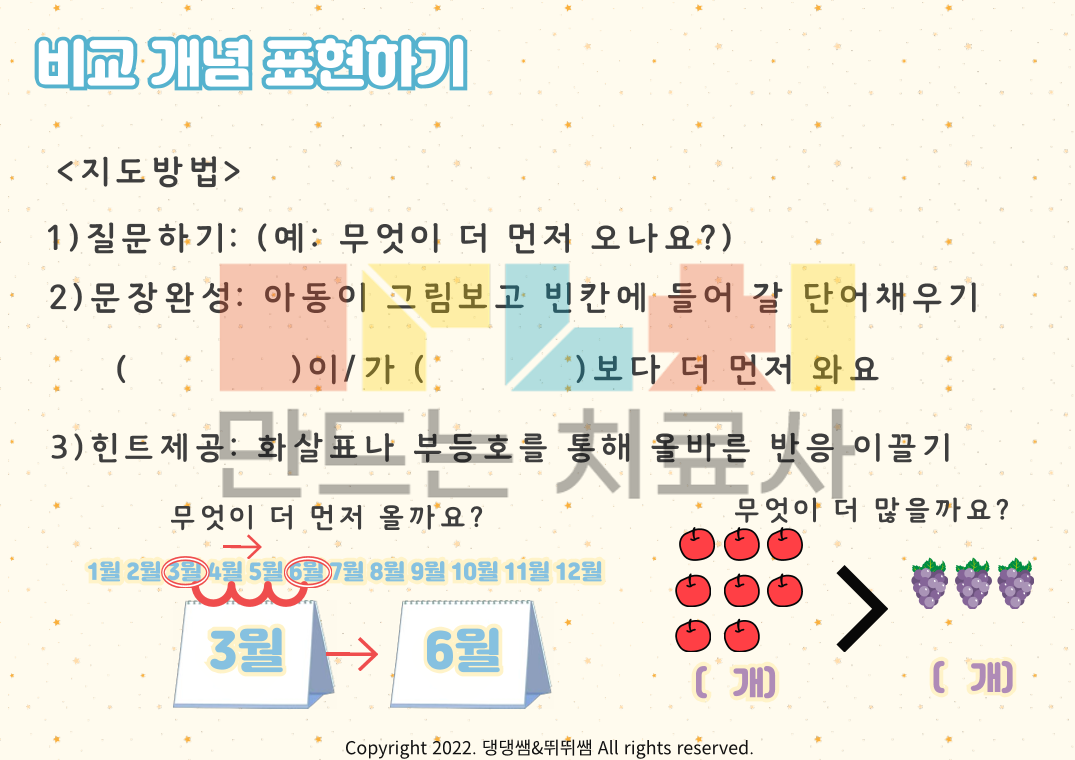 비교개념 이해 및 표현 3탄입니다. 수개념 특집으로 달력에서의 순서개념과 많다/적다의 양의 개념을 목표로합니다! '무엇이 무엇보다 더 ~하다' 구문이해 및 표현을 유도하는 자료에요. 3탄에서는 먼저/나중(달력 개념), 많다/적다 어휘를 목표로 다양한 그림과 함께 연습해 볼 수 있습니다. 구문이해와 함께 먼저/나중, 많다/적다를 마스터 해보아요