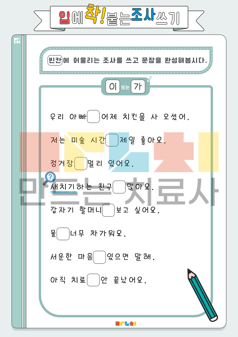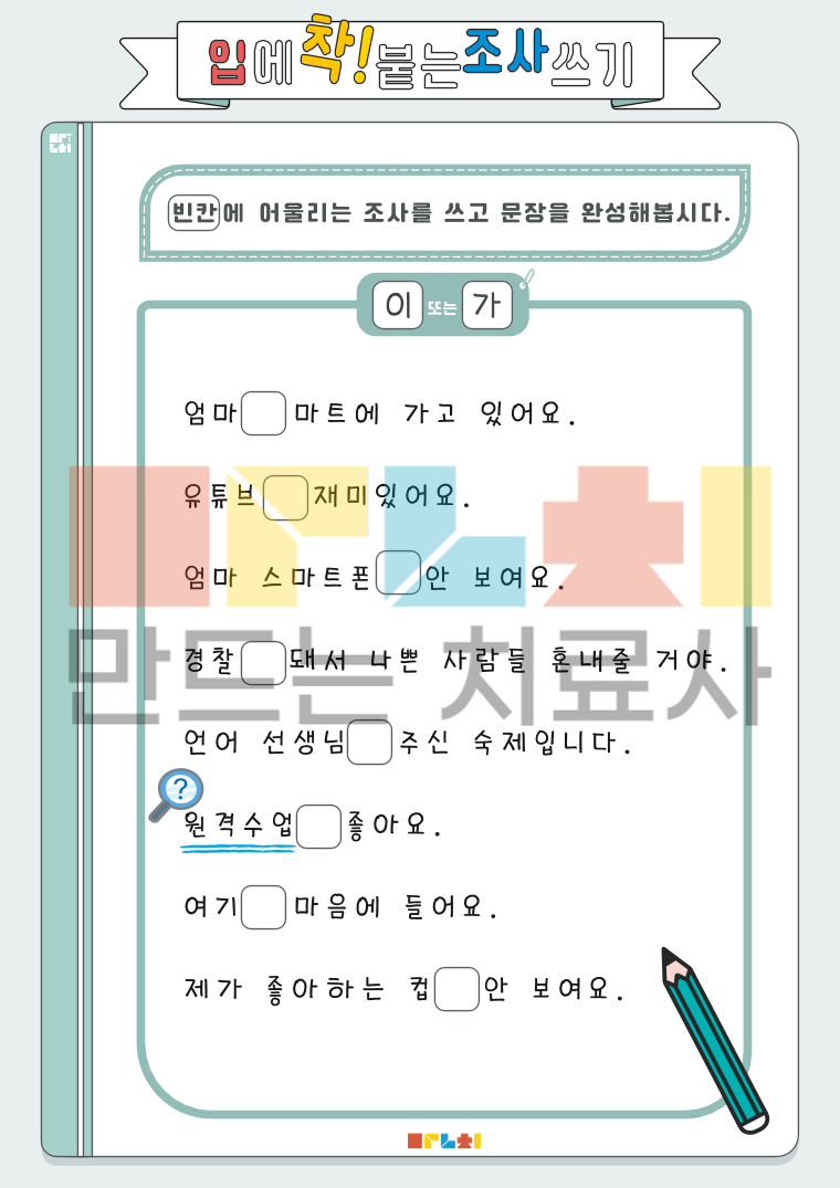 입에 착! 붙는 조사 쓰기 문장에 알맞는 조사를 바르게 사용하기를 위한 활동지 입니다 저는 이렇게 활용 했어요. -한 문장, 한 문장 그냥 넘어가지 않고 이야기 확장 유도 -돋보기 표시된 어휘 설명하기 유도 -완성된 문장 읽기를 통해 입에 붙는 조사 익히기