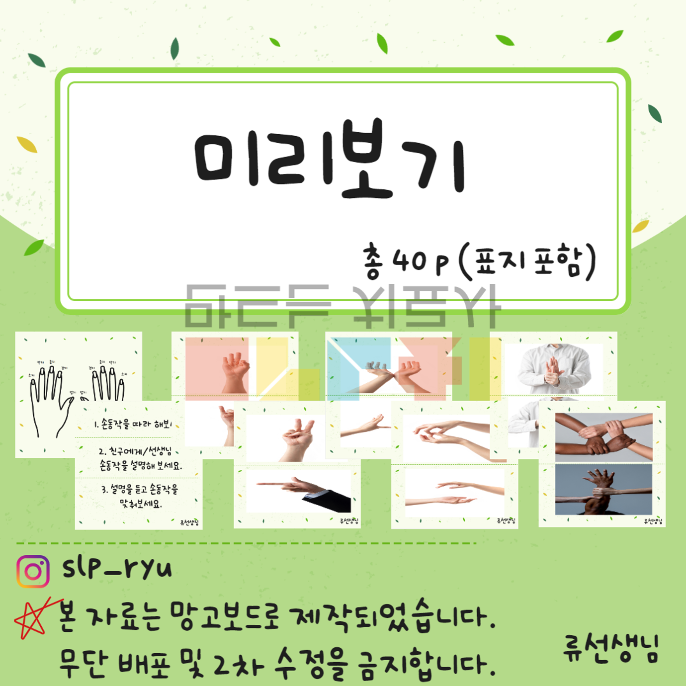 1. 손동작을 따라 해보세요. 2. 친구에게/선생님께 손동작을 설명해 보세요. 3. 설명을 듣고 손동작을 맞춰보세요. 짝 치료나 그룹 치료시에도 활용 가능합니다~ 문의 사항이 있으신 경우 언제든지 카톡 또는 인스타 DM 주세요~^^ 카톡 : rcmrjh618 인스타 : slp_ryu