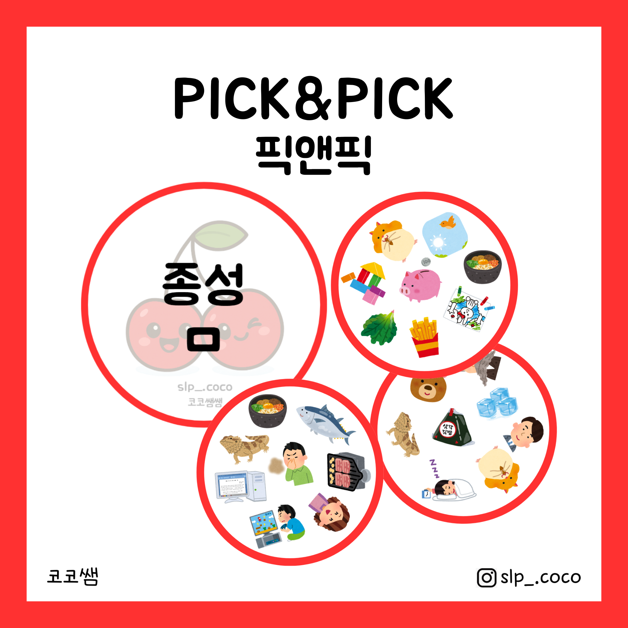 종성/ㅁ/ 조음 연습을 위한 자료입니다!! 게임을 진행하면 자연스럽게 단어수준에서 종성ㅁ 반복 연습 할 수 있어요. 단순한 조음 활동이 지루한 아동도 즐겁게 참여할 수 있어요! < 게임 방법 > 카드를 한 장 씩 자신의 앞에 두고 가운데에 남은 카드 더미를 둡니다. 더미와 내 카드에서 같은 그림을 찾아 외치세요! 그림은 단 하나만 일치합니다. 가장 먼저 찾은 사람이 더미에서 카드를 가져옵니다! 더미가 없어질 때까지 반복합니다. 가장 많은 카드를 모으는 사람이 승리합니다! 🎯 공통 그림을 찾고, 외치고, 이겨라!