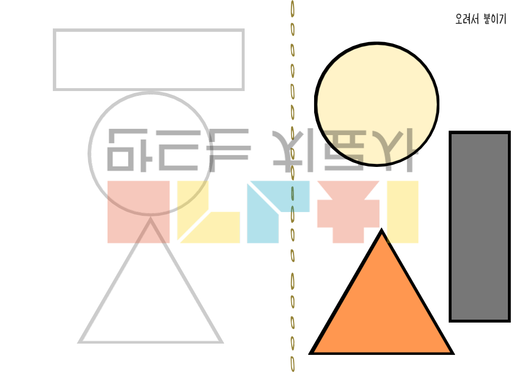 * 총 14가지의 활동지로, 도형을 오려서 붙이기 활동을 통하여 시지각, 주의력, 소근육, 눈손협응능력, 공간지각 능력 등의 향상을 목적으로 할 수 있습니다. * 활동지 수준은 초급 단계로 도형에 대한 이해를 높이며 4세-5세 아동에게 적합할 수 있습니다.