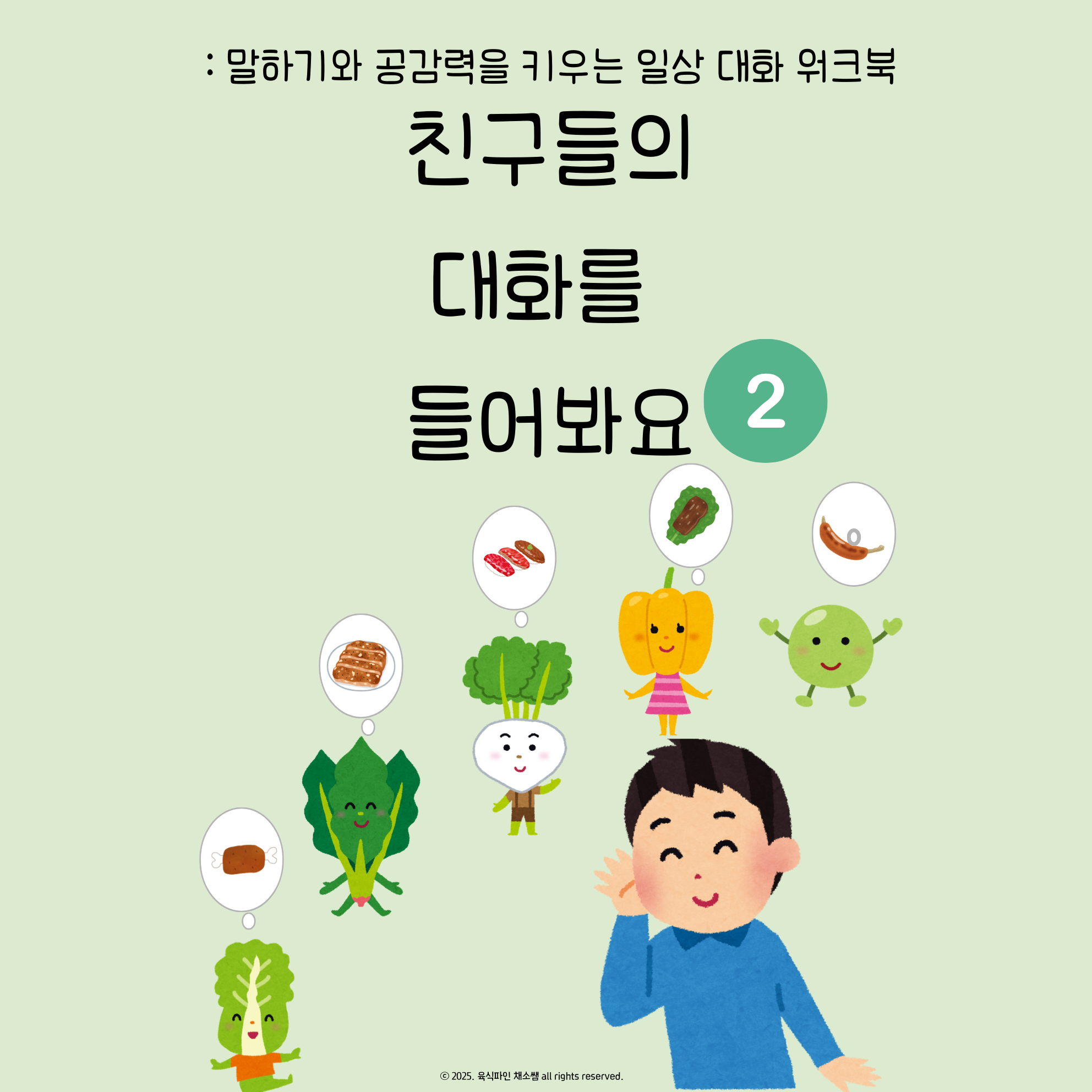 친구와 나누는 짧고 자연스러운 대화를 통해 말하기 + 듣기 + 생각하기 + 감정 이해를 동시에 키울 수 있도록 만들었습니다. 특히 초등 저학년 및 이해 속도가 느린 친구들도 쉽게 따라올 수 있도록 짧은 문장 + 친근한 주제로 구성되어 있습니다. 차례 지키기 의견 나누기 공감 표현하 상황 이해 감정 추론 이유 설명