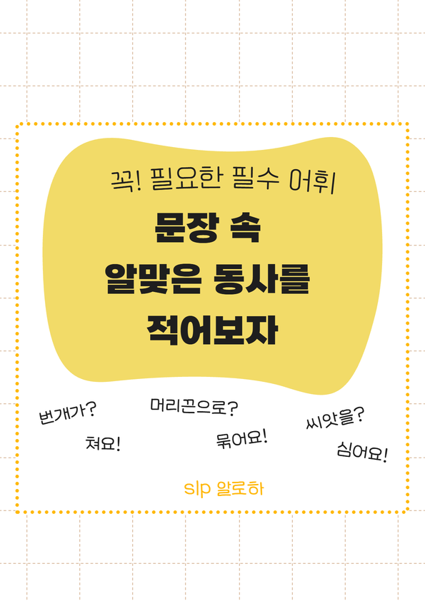 자료 설명 이 자료는 동사 어휘가 부족한 학령전기/ 학령기 아동을 위해 제작되었습니다. 아이들이 일상생활에서 자주 사용하는 고빈도 동사 어휘를 익힐 수 있습니다. 동사와 함께 문장 속 명사 어휘도 함께 학습해 보아요. 두가지 버전( close set/ open set )으로 구성되어 아동의 수준에 맞춰 활용하시거나, 복습용으로 사용하실 수 있습니다. 자료 구성 52가지 동사 어휘 (1page 당 13개) 3-6 page : 보기 있는 동사빈칸 7-10 page: 보기 없는 동사 빈칸