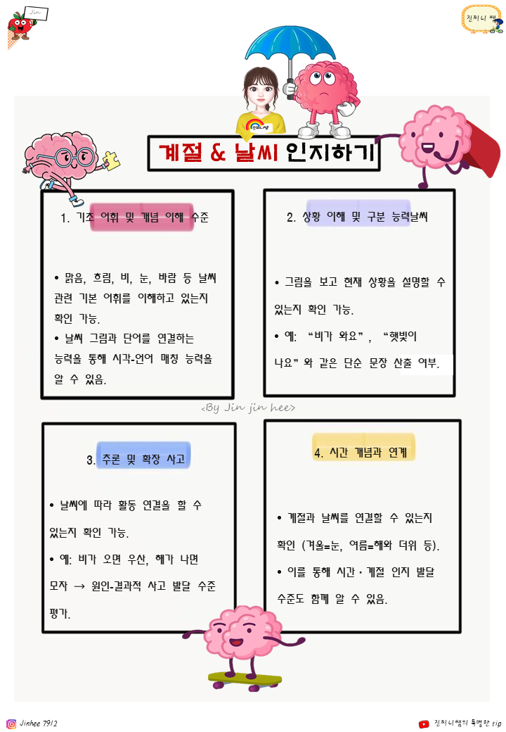 📘 「날씨 &계절인지」로 알 수 있는 것 1. 기초 어휘 및 개념 이해 수준 - 맑음, 흐림, 비, 눈, 바람 등 날씨 관련 기본 어휘를 이해하고 있는지 확인 가능. - 날씨 그림과 단어를 연결하는 능력을 통해 시각-언어 매칭 능력을 알 수 있음. 2. 상황 이해 및 구분 능력 - 날씨 그림을 보고 현재 상황을 설명할 수 있는지 확인 가능. - 예: “비가 와요”, “햇빛이 나요”와 같은 단순 문장 산출 여부. 3. 추론 및 확장 사고 - 날씨에 따라 활동 연결을 할 수 있는지 확인 가능. - 예: 비가 오면 우산, 해가 나면 모자 → 원인-결과적 사고 발달 수준 평가. 4. 시간 개념과 연계 - 계절과 날씨를 연결할 수 있는지 확인 (겨울=눈, 여름=해와 더위 등). - 이를 통해 시간·계절 인지 발달 수준도 함께 알 수 있음. 5. 언어 표현 및 의사소통 능력 - 단순한 날씨 명칭 말하기에서 → 문장 표현(“오늘은 덥다”, “눈이 오면 장갑을 낀다”)으로 확장할 수 있는지 확인 가능. - 언어적 설명이 부족하다면, 어휘 부족·표현의 어려움을 알 수 있음.