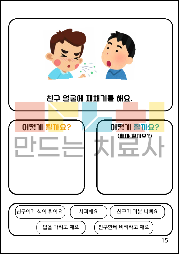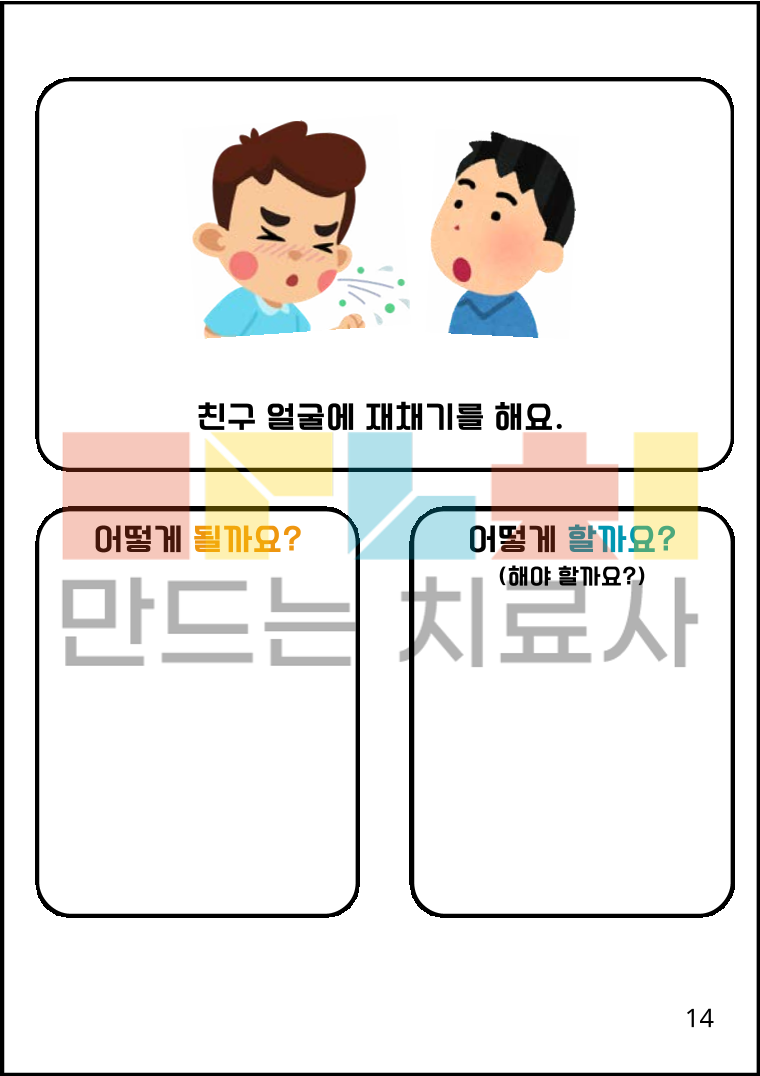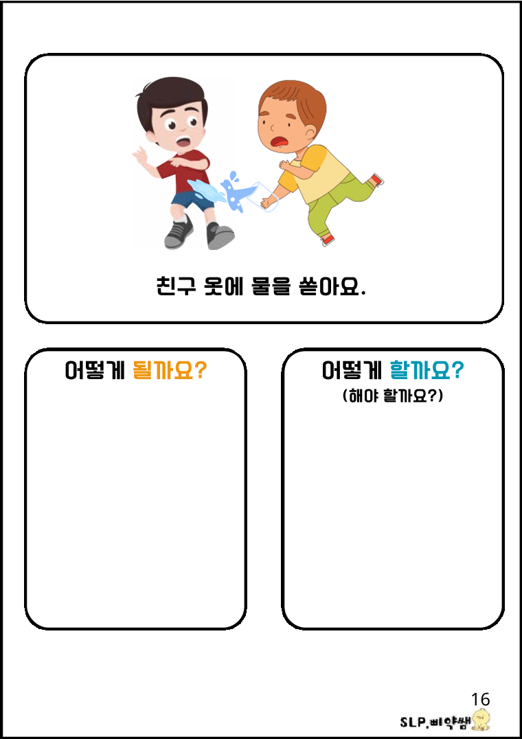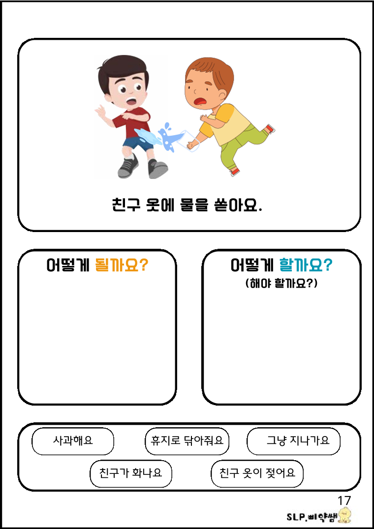 '어떻게'의문사를 어려워하는 아동들이 많아요. '어떻게' 가 똑같지만 뒤에 '될까요?'가 오는지 '할까요?'가 오는지에 따라 또 대답이 달라져야하죠.. 활용이 어려운 아이들을 위해 만들어보았습니다.