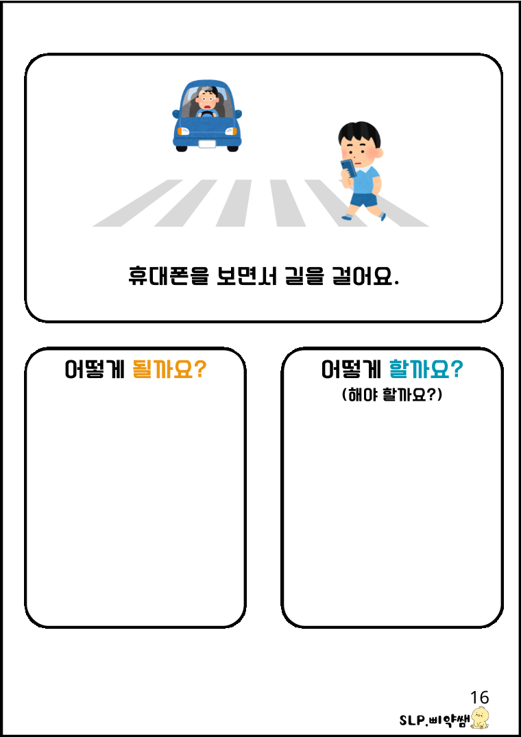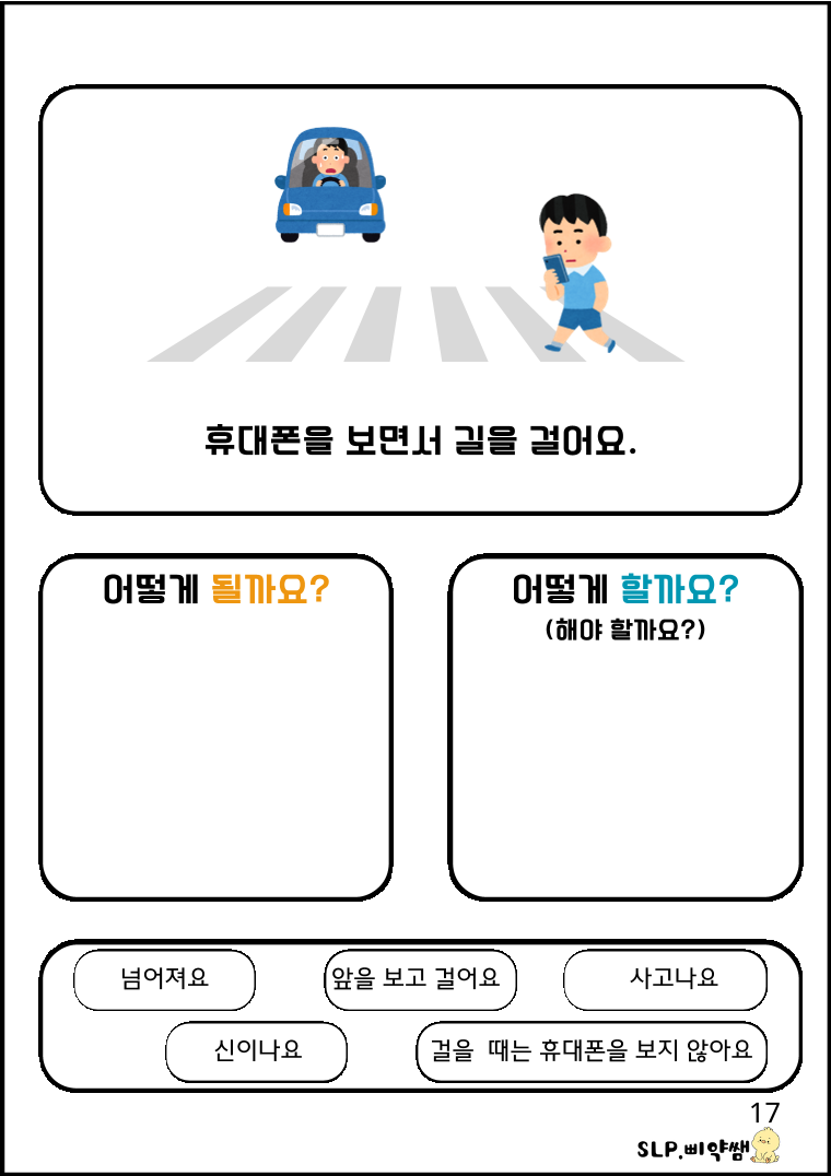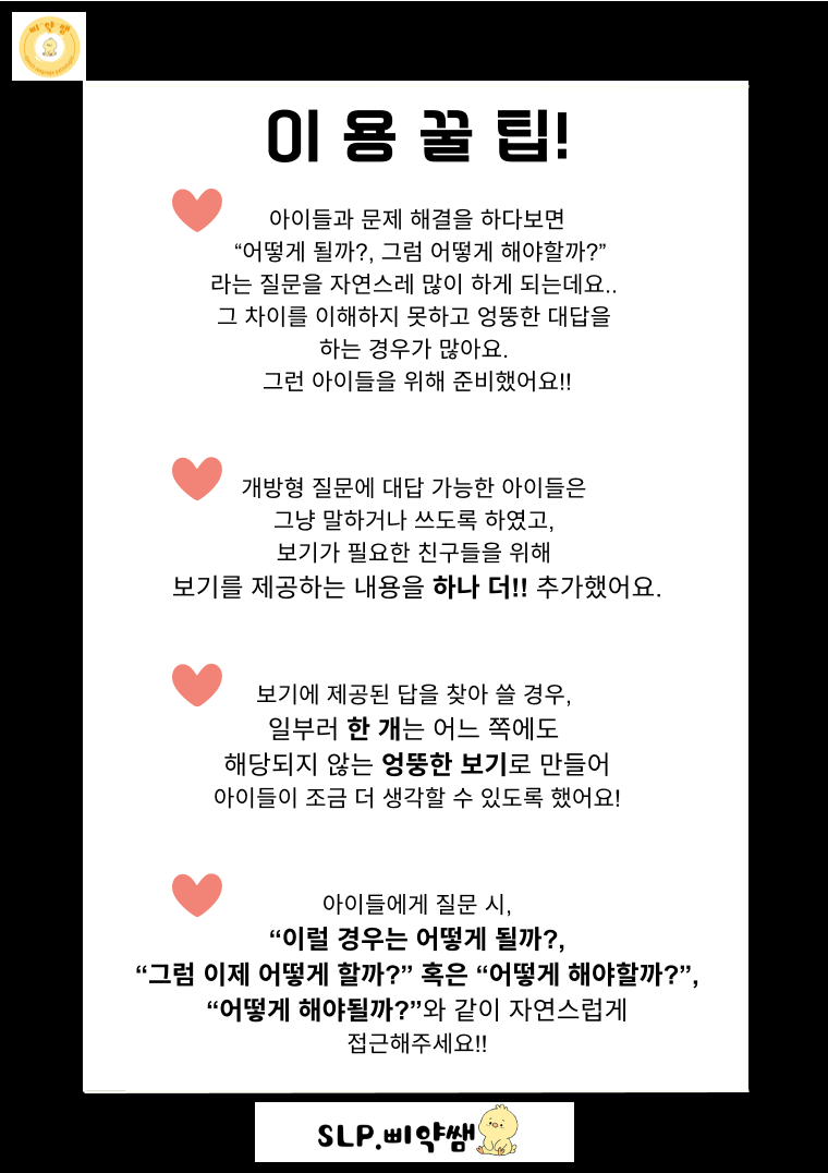 어떻게 될까?와 어떻게 할까?를 구별할 수 있도록 만든 자료입니다. 개방형 질문에 답할 수 있게 하였고, 그게 어려운 아이들은 보기를 제공하여 고를 수 있도록 하였습니다. 보기 중 하나는 상관 없는 보기를 만들어 확실히 알 수 있도록 했습니다.