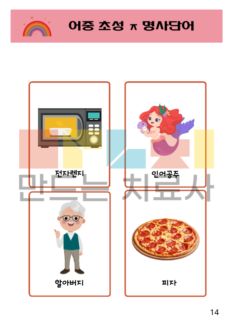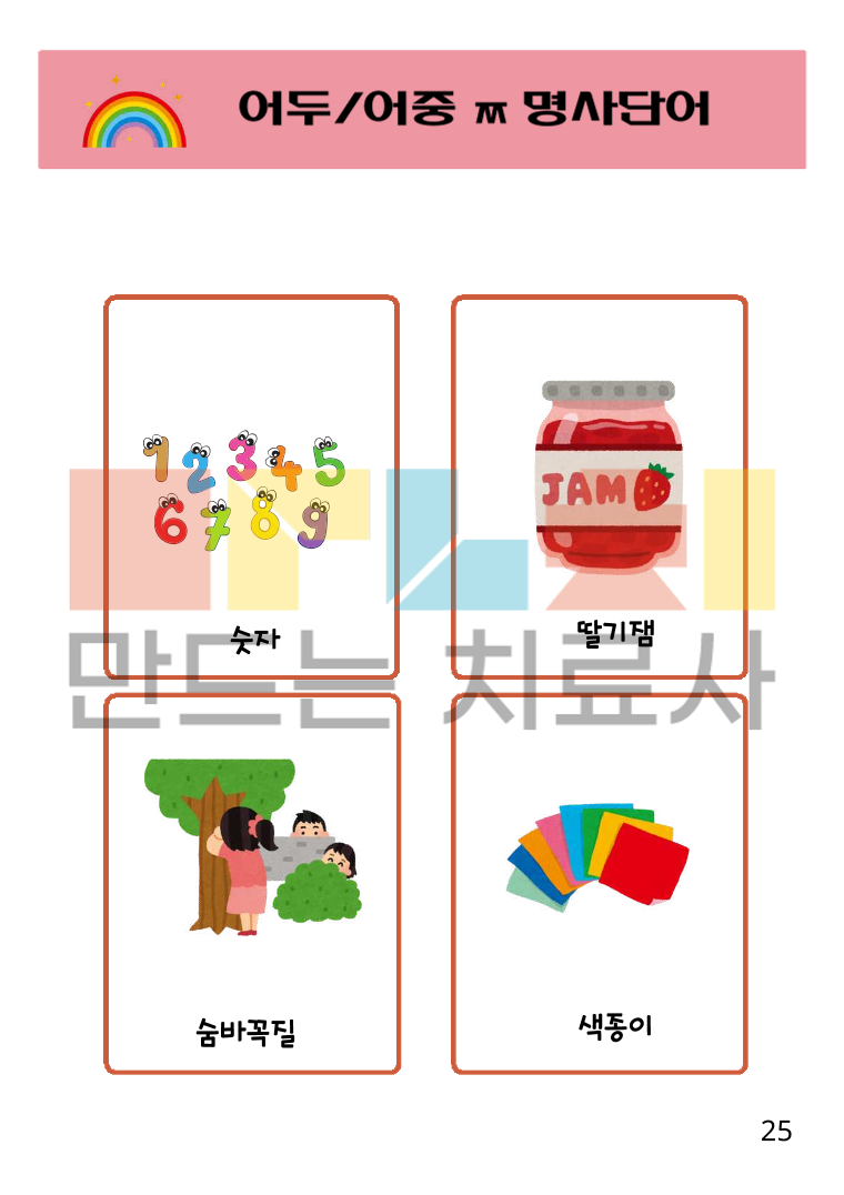 파찰음 /ㅈ,ㅊ,ㅉ/를 연습할 수 있도록 구성했습니다. 단어 수준(명사) : 어두, 어중 ㅈ, 어두,어중 ㅊ, 어두 및 어중 ㅉ 단어 수준(동사,형용사) : 어두, 어중 ㅈ, ㅊ, ㅉ 3어문 조합 문장 수준 까지 구성하여 다양한 수준 별로 연습할 수 있어요. 많은 도움이 되기를 바랍니다.