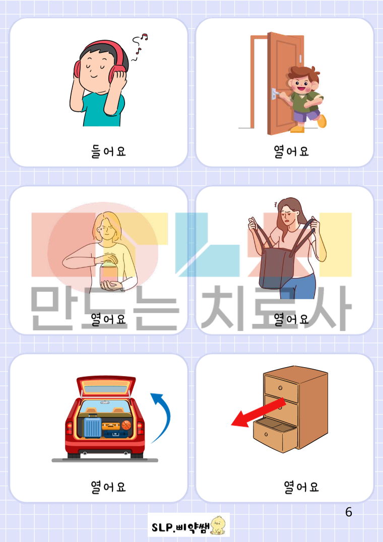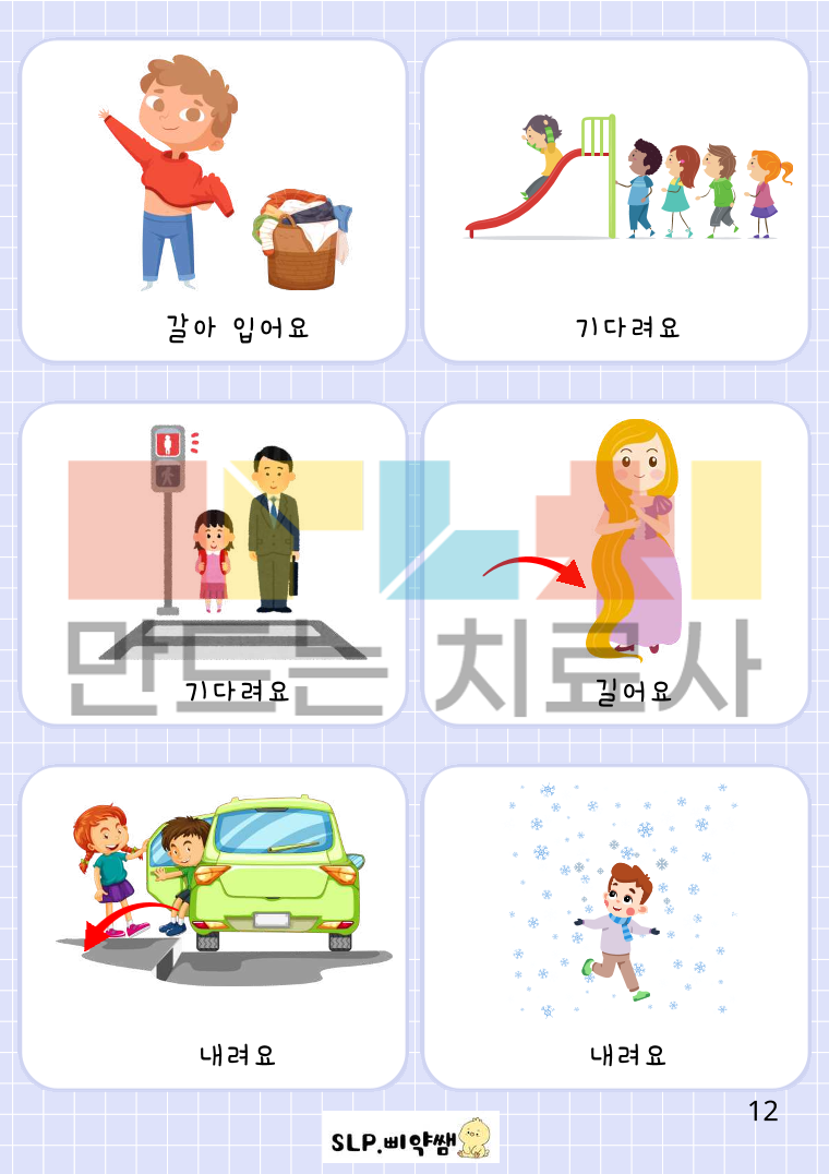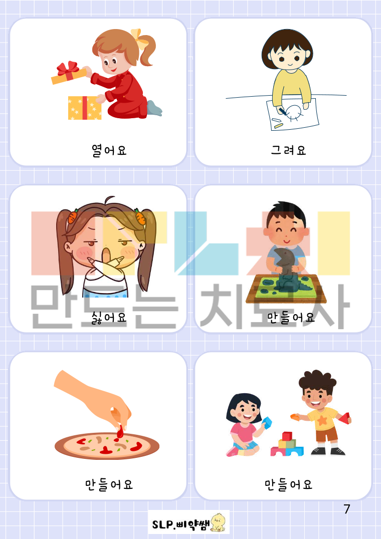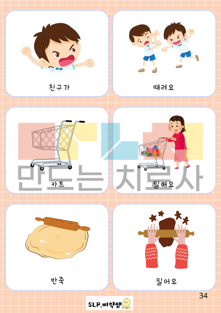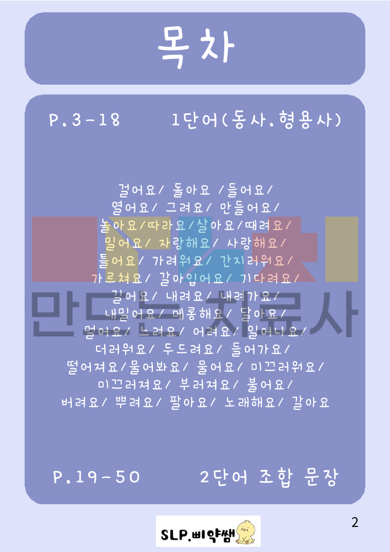 아이들에게 ㄹ 조음을 가르칠 때 가장 어려운 부분이 "어중 ㄹ" 이죠.. 명사 단어를 많이 알려주다보니, 동사 및 형용사에서 부족한 부분이 많은 것 같아 제작하게 되었습니다. 44가지 다양한 고빈도 동사, 형용사로 구성였고, 필요한 경우 같은 동사 및 형용사 단어로 여러 가지 주어 및 목적어를 달리 적용하여 반복 연습할 수 있도록 만들었습니다.