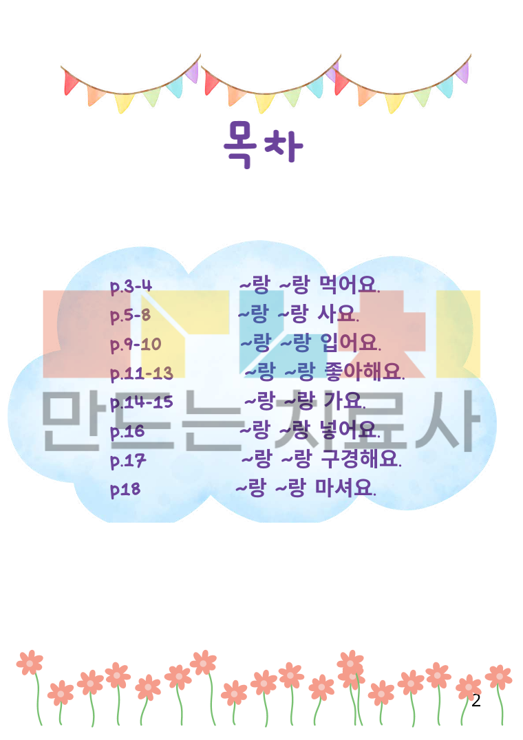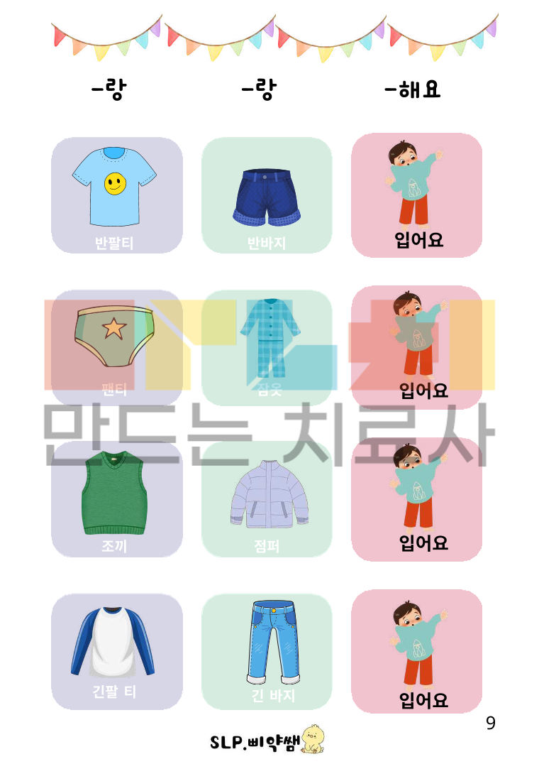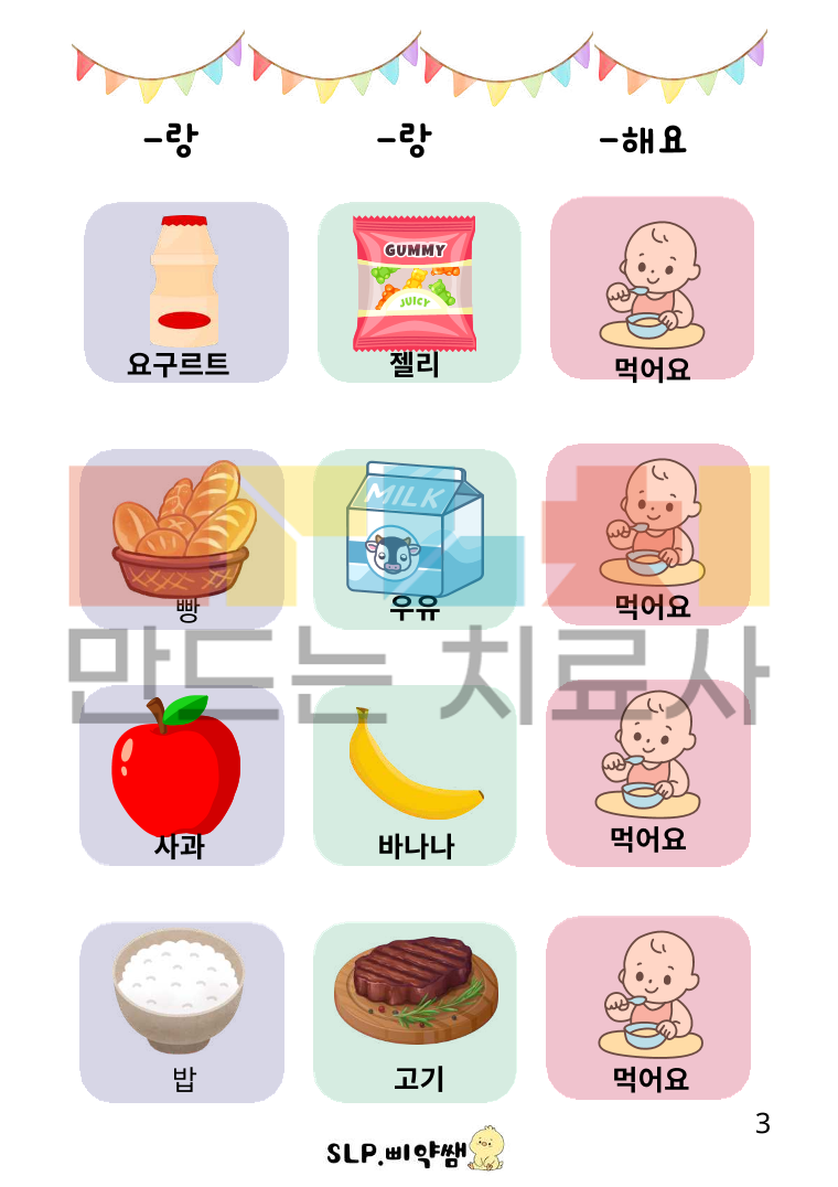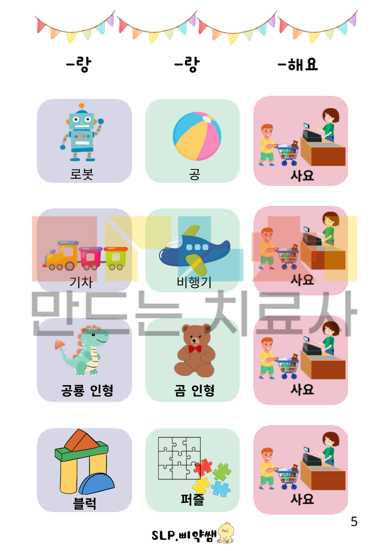 안녕하세요, 삐약쌤입니다. 아이들이 많이 하는 문장 중 하나가 "-랑 -랑 -해요" 입니다. 어중 ㄹ중재 하는 아동이 이 문장을 말 하기 어려워 해 집중적으로 만든 자료인데요.. 공존격 조사 '-랑'을 사용해 문장 말하기 하는 아동에게도 도움이 될 수 있습니다. 많은 도움이 되었으면 좋겠습니다.