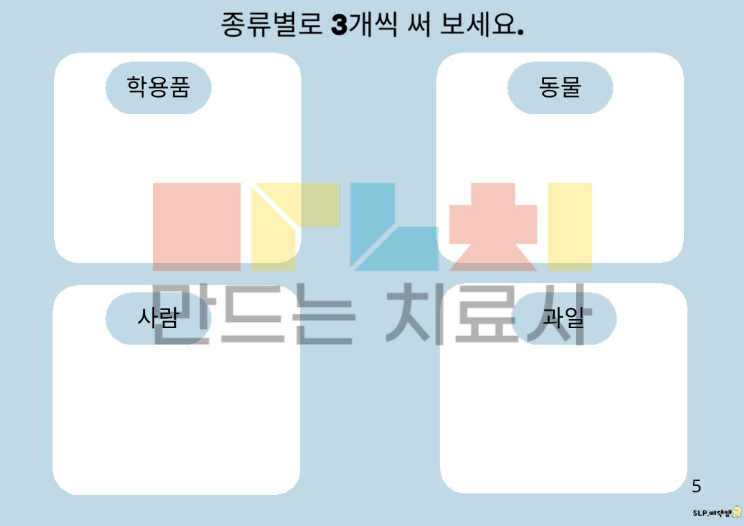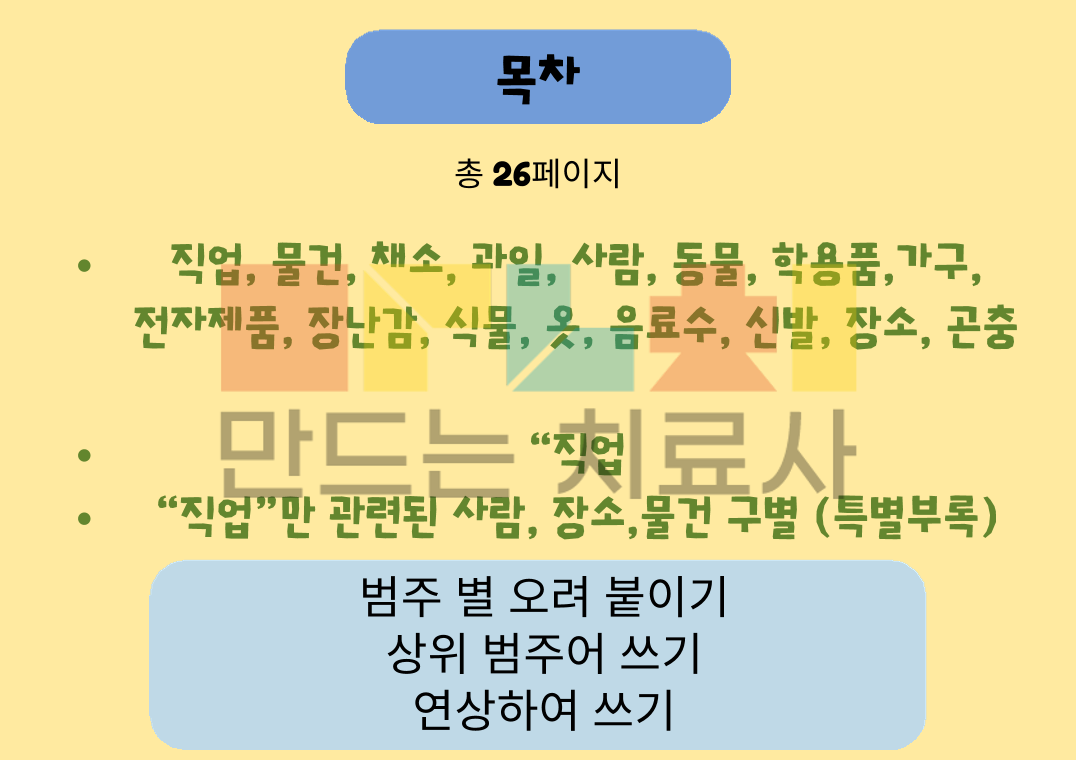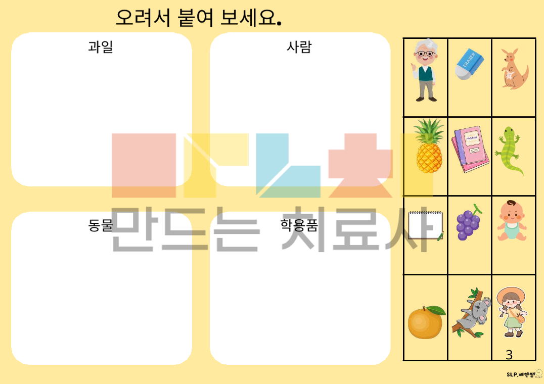 안녕하세요^^ 삐약쌤입니다. 기본적으로 상,하위 범주어를 어느 정도 익힌 아이들이어도 반복이 필요한 아이들이 꼭 있죠..!! 그런 아이들을 위해 분류하면서 오려 붙이기, 그림 보고 상위 범주어 쓰기, 연상하기 과제를 통해 다시 연습할 수 있도록 과제를 만들었습니다.
