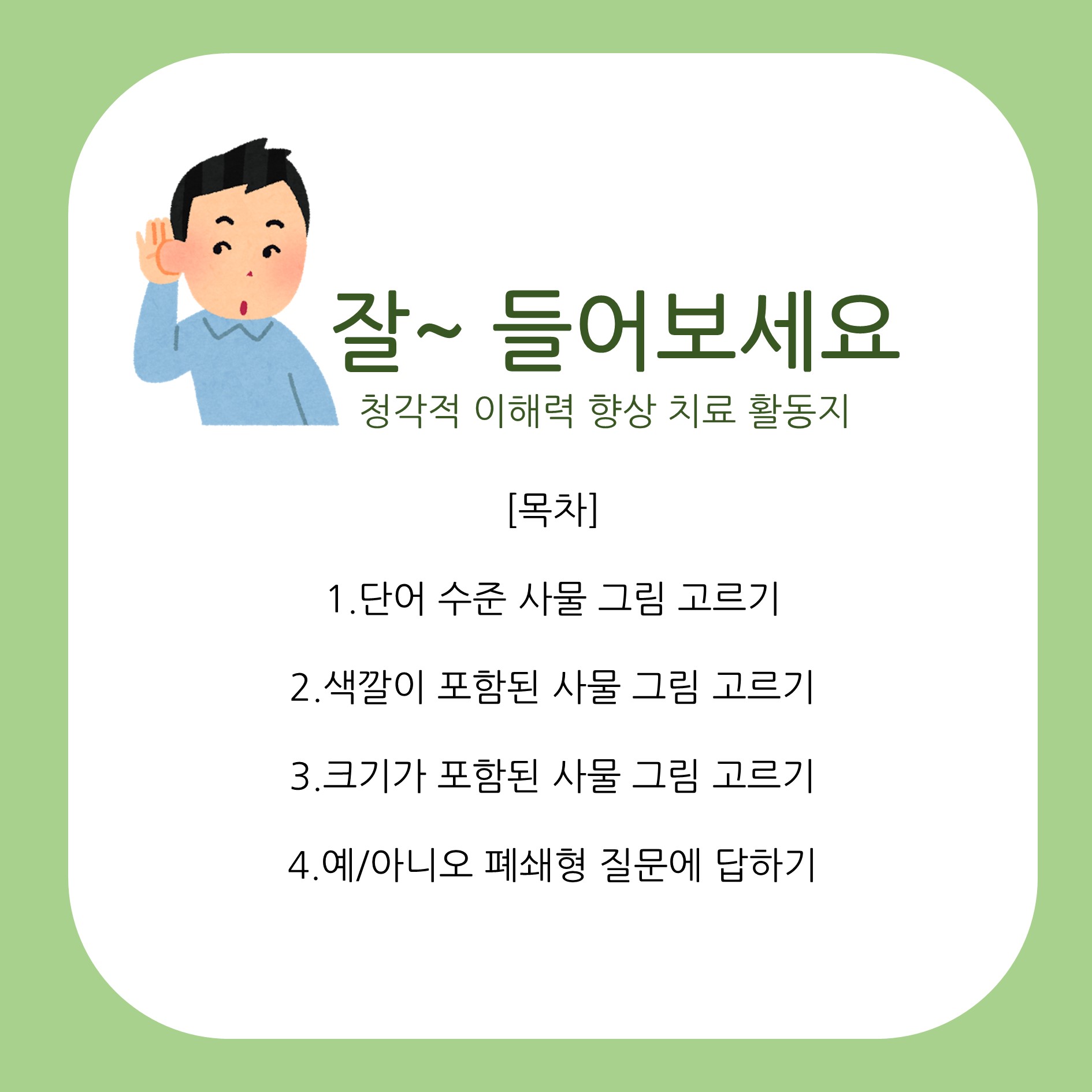 해당 자료는 aphasia 환자의 청각적 이해력 증진과 소아 대상 청각적 주의력 과제 활동으로도 활용할 수 있습니다!