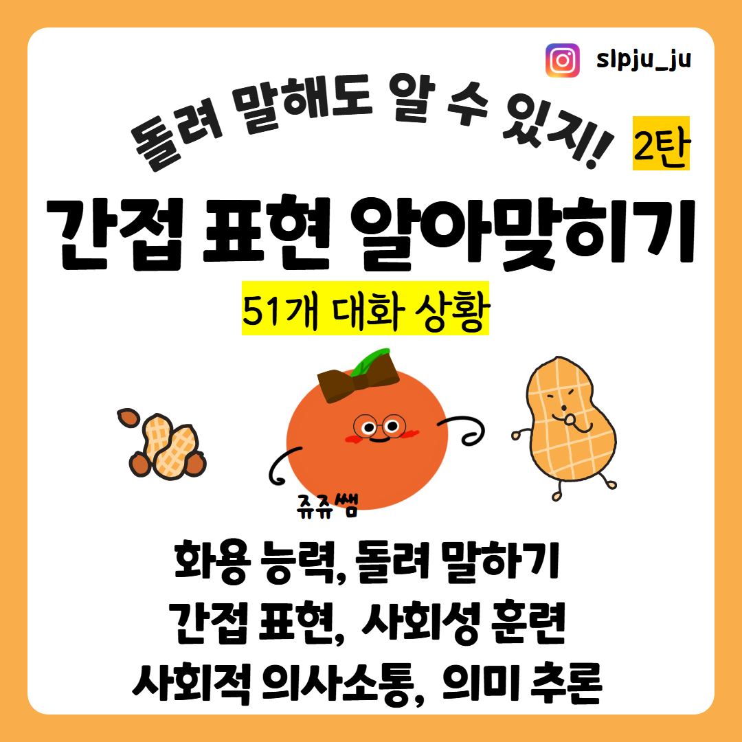 안녕하세요 쥬쥬쌤입니다. 간접 표현을 읽어야 소통이 열린다. 간접 표현 이해 훈련으로 대화 주제 유지, 눈치력, 상호작용 기술(화용)을 효과적으로 향상시켜 보세요. 활동 과정에서 아동은 발화의 맥락과 숨은 의도를 파악하며 상황에 적절한 반응을 선택하는 사회적 의사소통 전략을 학습합니다.