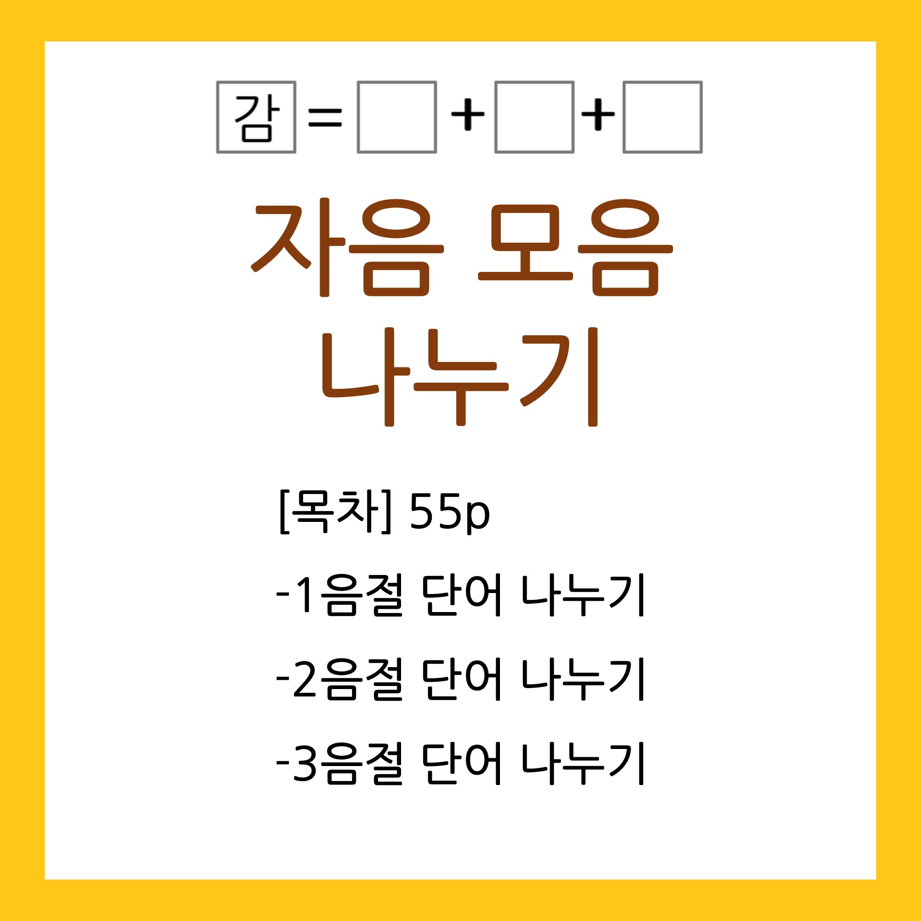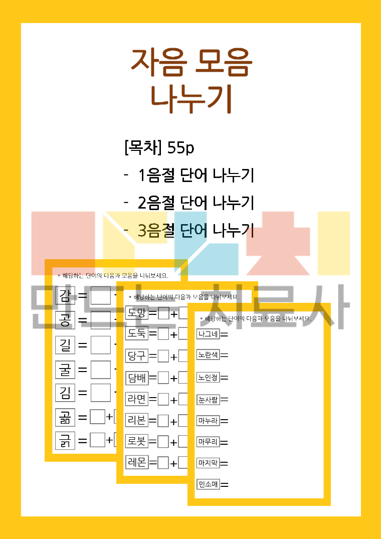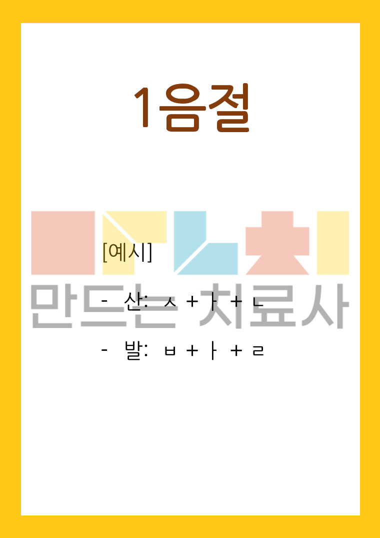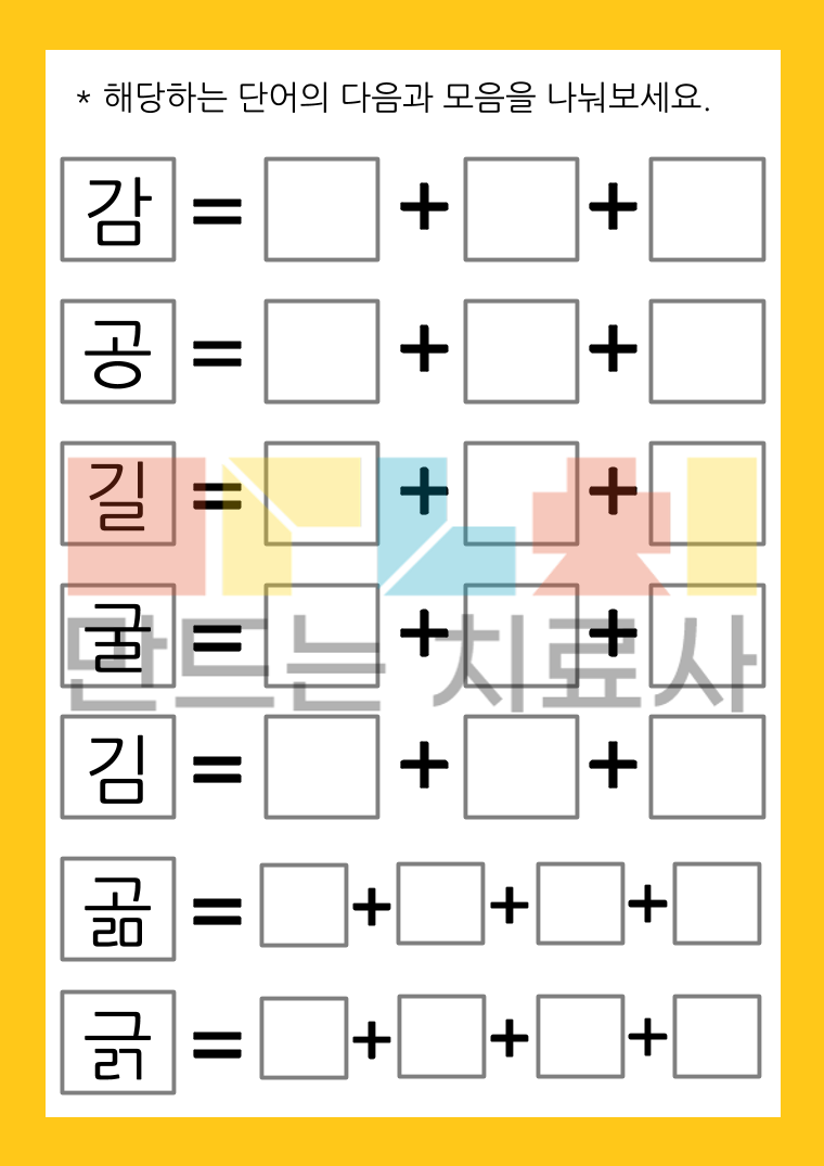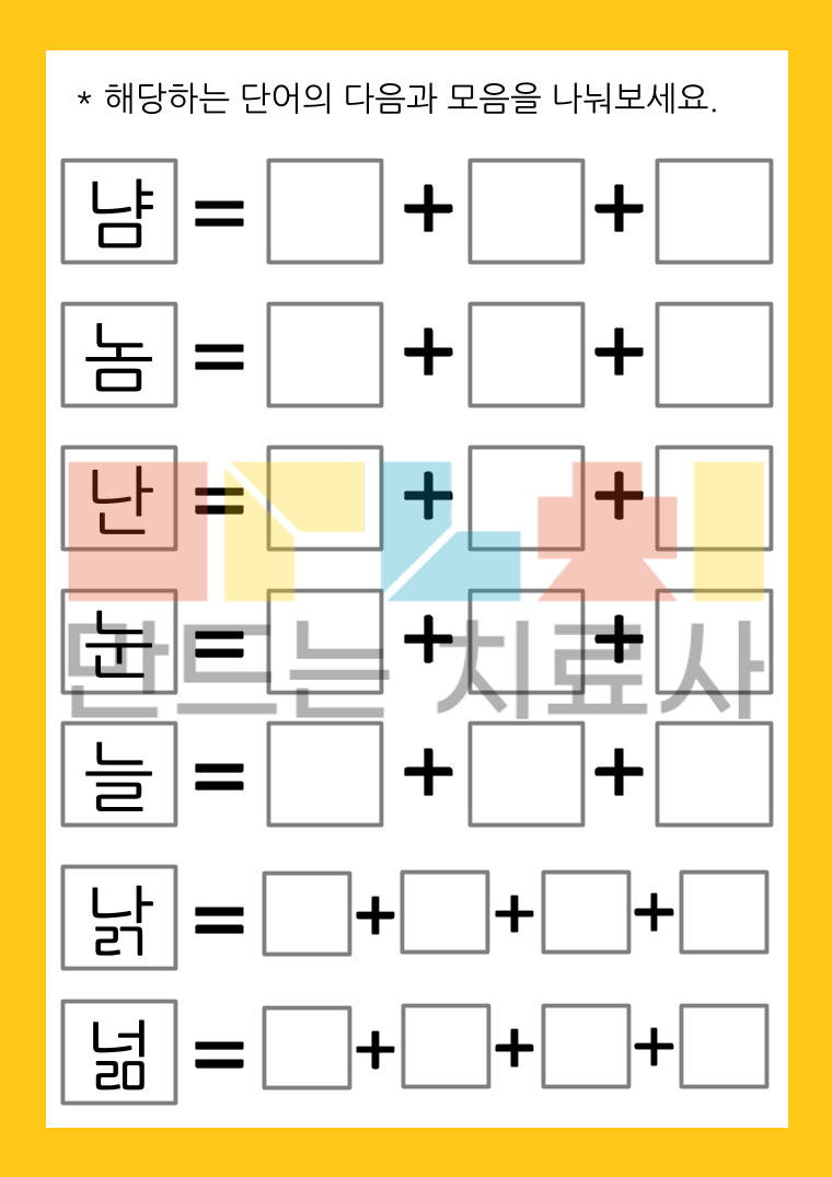 설명: 1-3음절 의미단어 수준에서 자음과 모음을 나누어 인식하고 적는 연습 활동지 입니다. 실어증 환자분들의 문해/쓰기 능력 향상을 위해 만들었지만, 성인뿐 아니라 학령기 이상 학생들을 대상으로 사용하셔도 좋습니다!