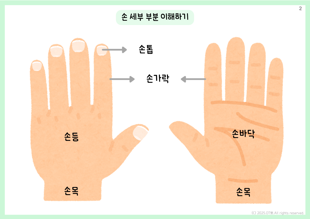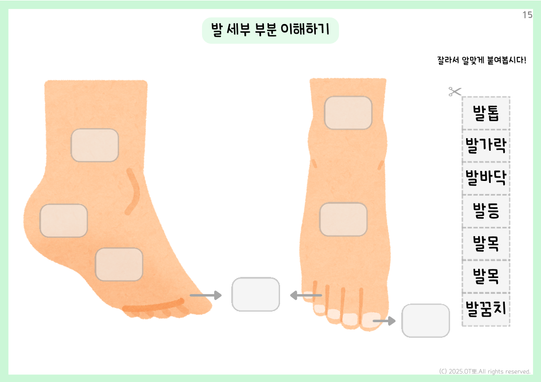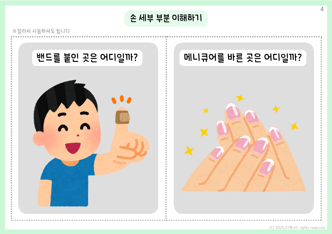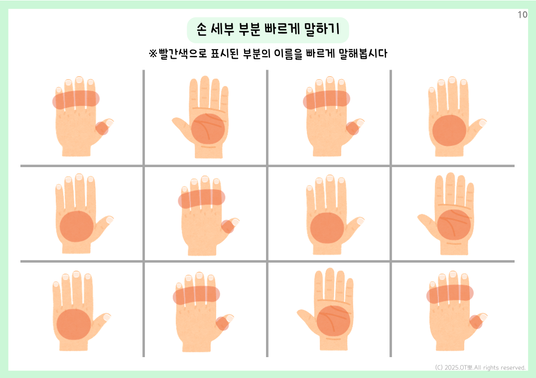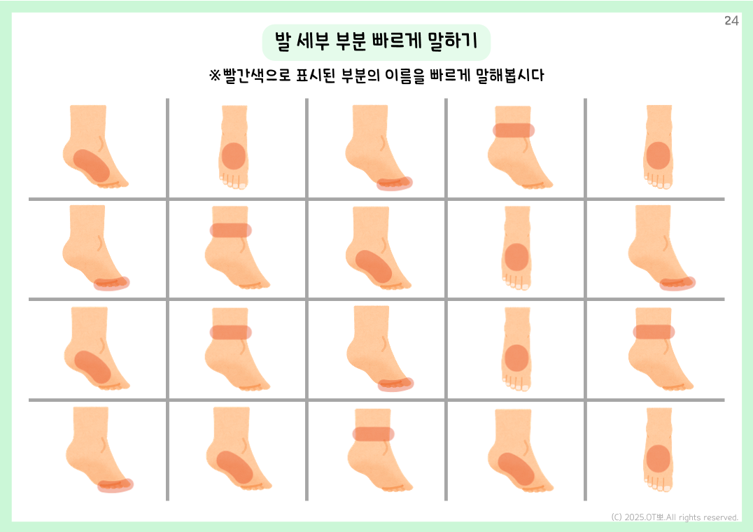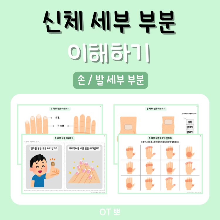 *자료 구성 : 총 25p / PDF 파일 *자료 설명 : 손 / 발의 세부 부분에 대한 이해를 목표로 제작되었습니다 : 소근육, 눈-손 협응, 청각 주의집중, 정보처리 등 다양하게 활용하실 수 있습니다.