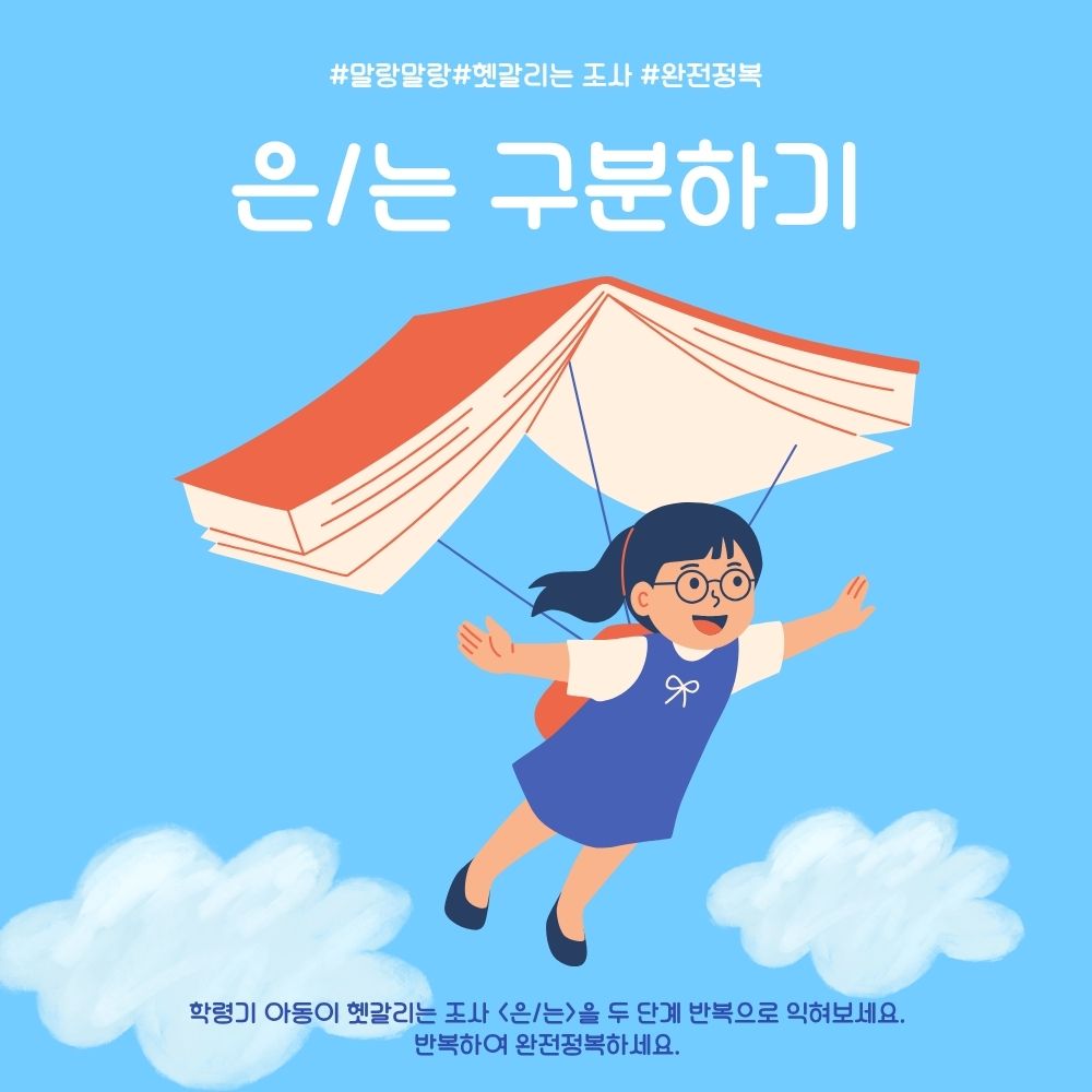 학령기 아동이 헷갈리는 조사 '은/는'을 두 단계 반복으로 익혀보세요. 반복하여 완전 정복하세요.