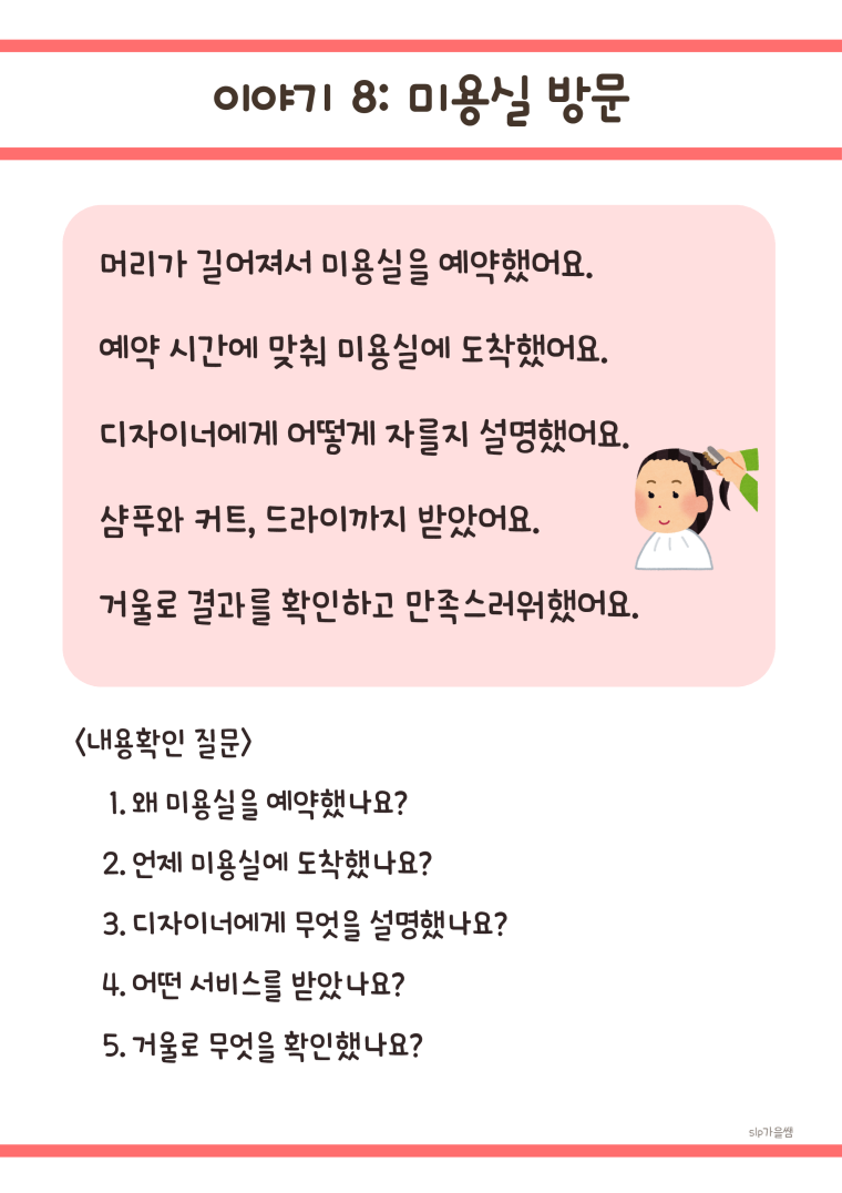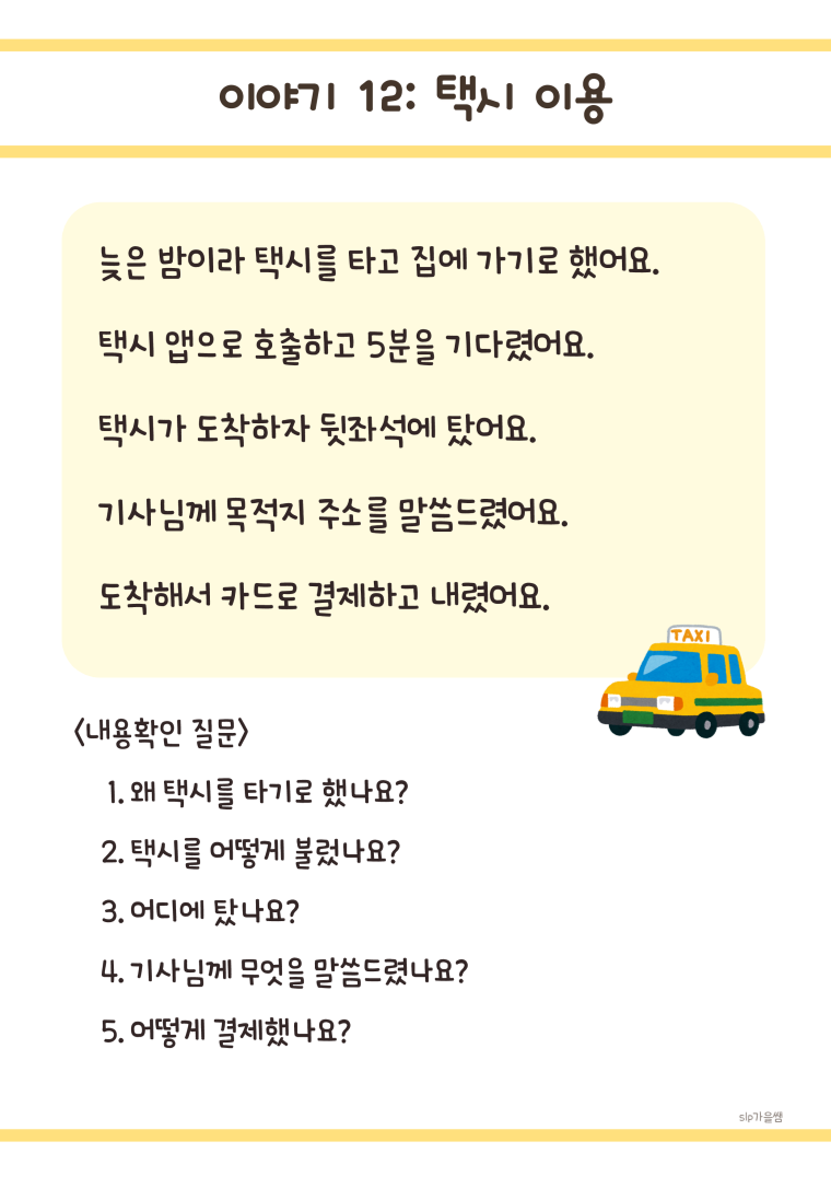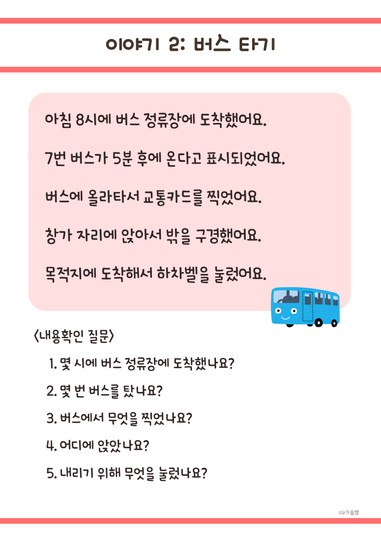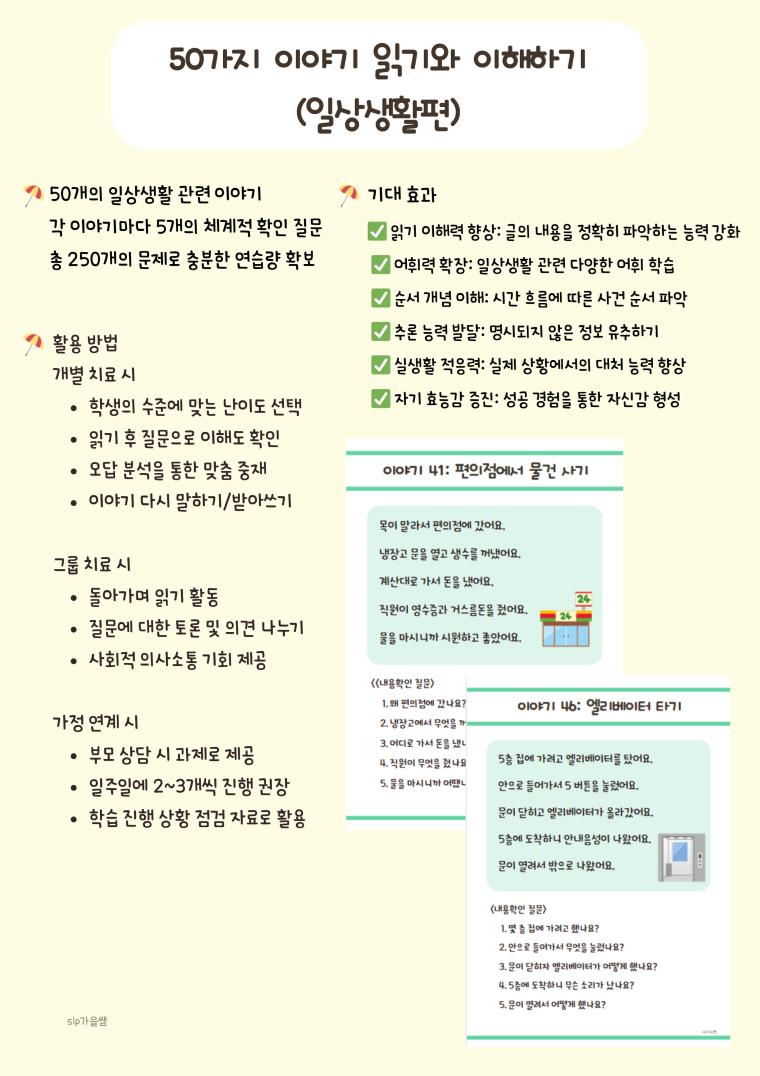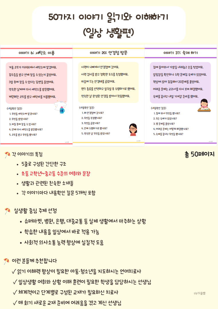 총 50개의 이야기입니다. 📚 일상생활 중심 5줄 이야기 이해 학습지 언어치료 현장에서 바로 사용 가능한 실용적 교재 ✅<이런 분들께 추천합니다> ✓ 읽기 이해력 향상이 필요한 아동·청소년을 지도하시는 언어치료사 ✓ 일상생활 어휘와 상황 이해 훈련이 필요한 학생을 담당하시는 선생님 ✓ 체계적이고 단계별로 구성된 교재가 필요하신 치료사 ✓ 매 회기 새로운 교재 준비에 어려움을 겪고 계신 선생님 ✅<교재의 특징> 1. 실생활 중심 주제 선정 슈퍼마켓, 병원, 은행, 대중교통 등 실제 생활에서 마주하는 상황 학습한 내용을 일상에서 바로 적용 가능 사회적 의사소통 능력 향상에 실질적 도움 2. 체계적인 5줄 구성 간결하면서도 완결된 이야기 구조 시간 순서와 인과관계 파악 훈련 집중력 유지에 적합한 분량 3. 목표 지향적 질문 구성 각 이야기마다 5개의 내용확인 질문 제공 세부정보 파악, 순서 이해, 추론 능력 평가 가능 치료 목표 설정 및 진전도 측정에 활용 ✅<활용 방법> -개별 치료 시 학생의 수준에 맞는 난이도 선택 읽기 후 질문으로 이해도 확인 오답 분석을 통한 맞춤 중재 -그룹 치료 시 돌아가며 읽기 활동 질문에 대한 토론 및 의견 나누기 사회적 의사소통 기회 제공 -가정 연계 시 부모 상담 시 과제로 제공 일주일에 2~3개씩 진행 권장 학습 진행 상황 점검 자료로 활용 <기대 효과> ✅ 읽기 이해력 향상: 글의 내용을 정확히 파악하는 능력 강화 ✅ 어휘력 확장: 일상생활 관련 다양한 어휘 학습 ✅ 순서 개념 이해: 시간 흐름에 따른 사건 순서 파악 ✅ 추론 능력 발달: 명시되지 않은 정보 유추하기 ✅ 실생활 적응력: 실제 상황에서의 대처 능력 향상 ✅ 자기 효능감 증진: 성공 경험을 통한 자신감 형성 "읽기만 하고 끝나는 게 아쉬워요" → 체계적인 질문으로 이해도 점검 및 확장 활동 가능 "실생활과 연결되는 내용이 필요해요" → 모든 이야기가 실제 경험 가능한 일상 상황 ✅언어치료 현장의 실무자가 직접 제작했습니다 현직 언어치료사의 임상 경험을 바탕으로 실제 치료 현장에서 검증된 내용과 구성으로 선생님들의 소중한 시간을 아껴드립니다.