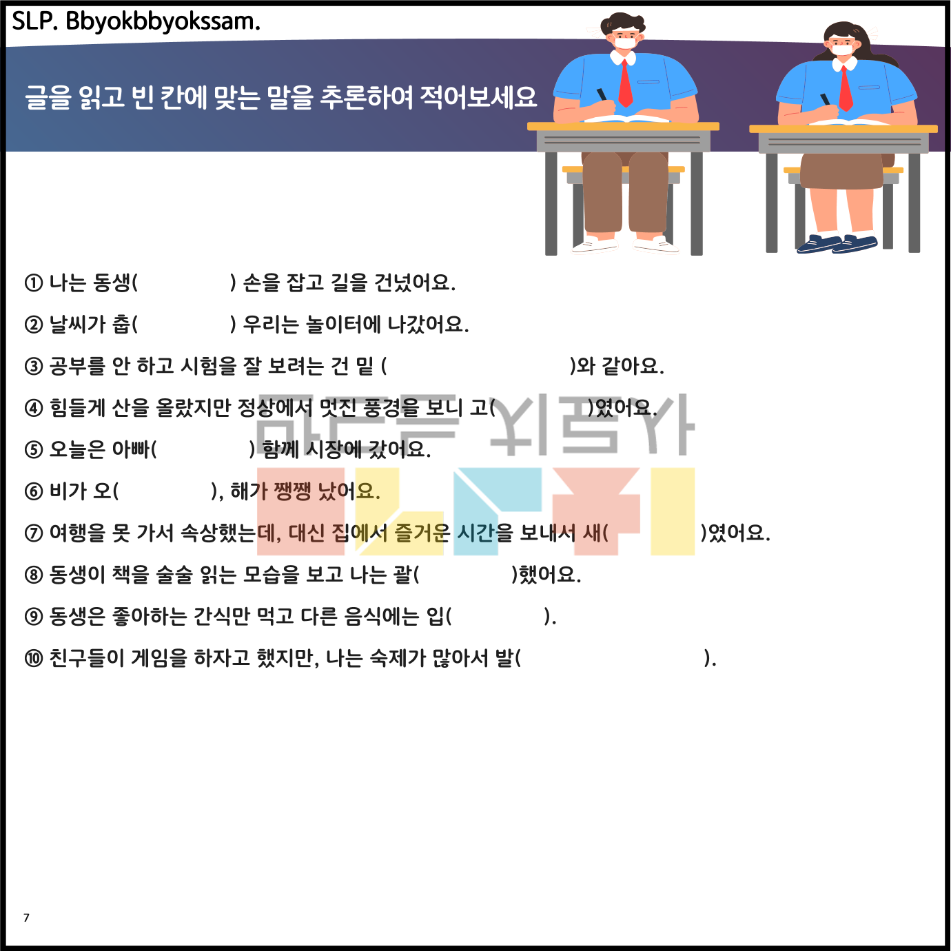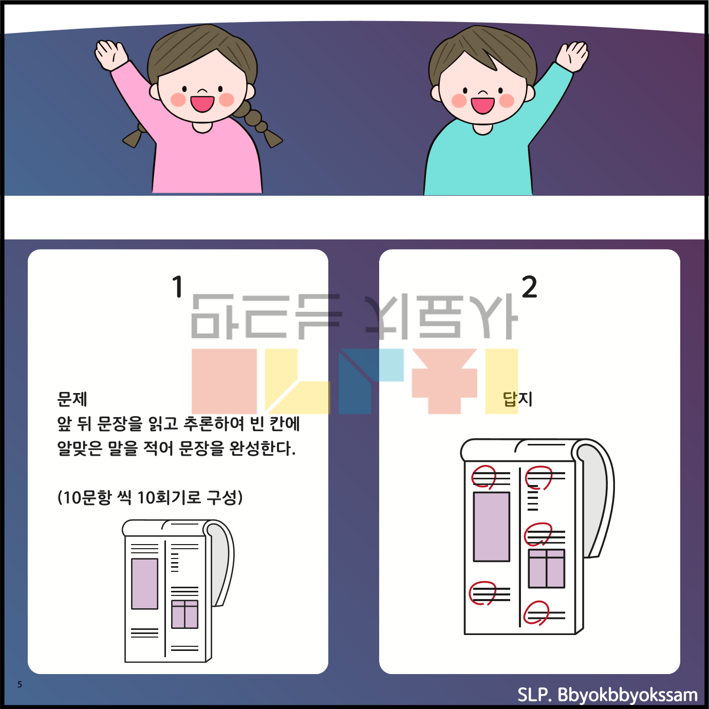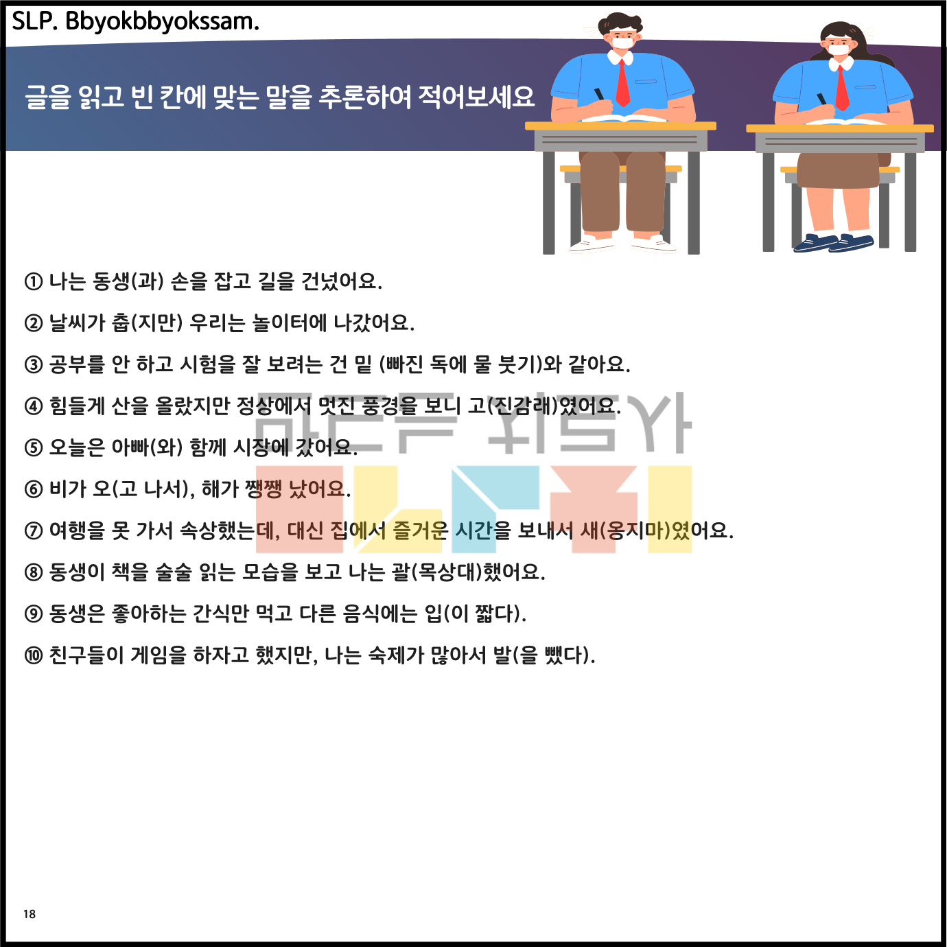 이번 교재는 조사, 접속사, 다양한 속담과 관용어, 고사성어를 넣어두었습니다. 각 10문항씩 10페이지로 구성되었습니다. 구성은 문제와 답안지로 구성되어있습니다. 앞 뒤 문장을 읽으며 빈칸이 "조사, 어휘 활용, 접속사, 사자성어, 속담, 관용어"로 구성되어 있어 읽고 이해한 후 채워넣는 과제가 10문제씩 10회기로 구성되어 있습니다. 답안지에는 정답이 모두 적혀 있습니다.