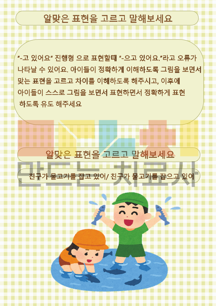 '-고 있어요' 진행형으로 표현 할때 '-으고 있어요' 라고 오류가 나타날수 있어요. 아이들이 정호가하게 이해하도록 그림을 보면서 맞는 표현을 고르고 차이를 이해하도록 해주세요!