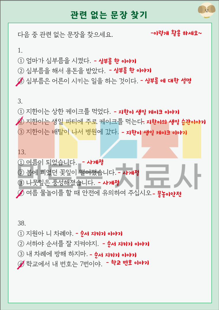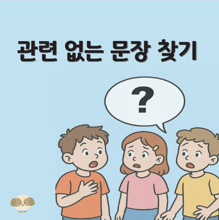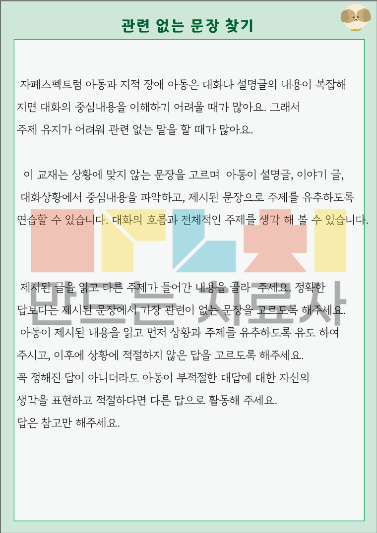 이 교재는 상황에 맞지 않는 문장을 고르며 아동이 설명글 이야기 글, 대화 상황에서 중심내용을 파악하고 제시된 문장으로 주제를 유추하도록 연습할 수 있습니다. 제시된 글을 읽고 다른주제가 들어간 내용을 골라주세요!