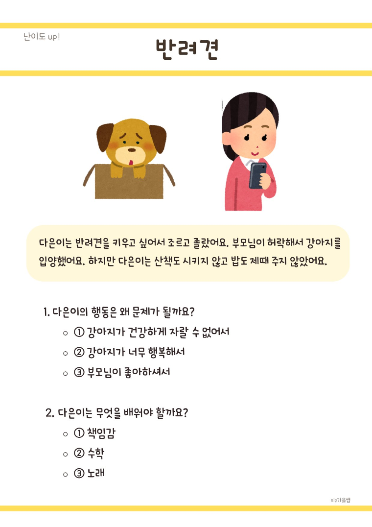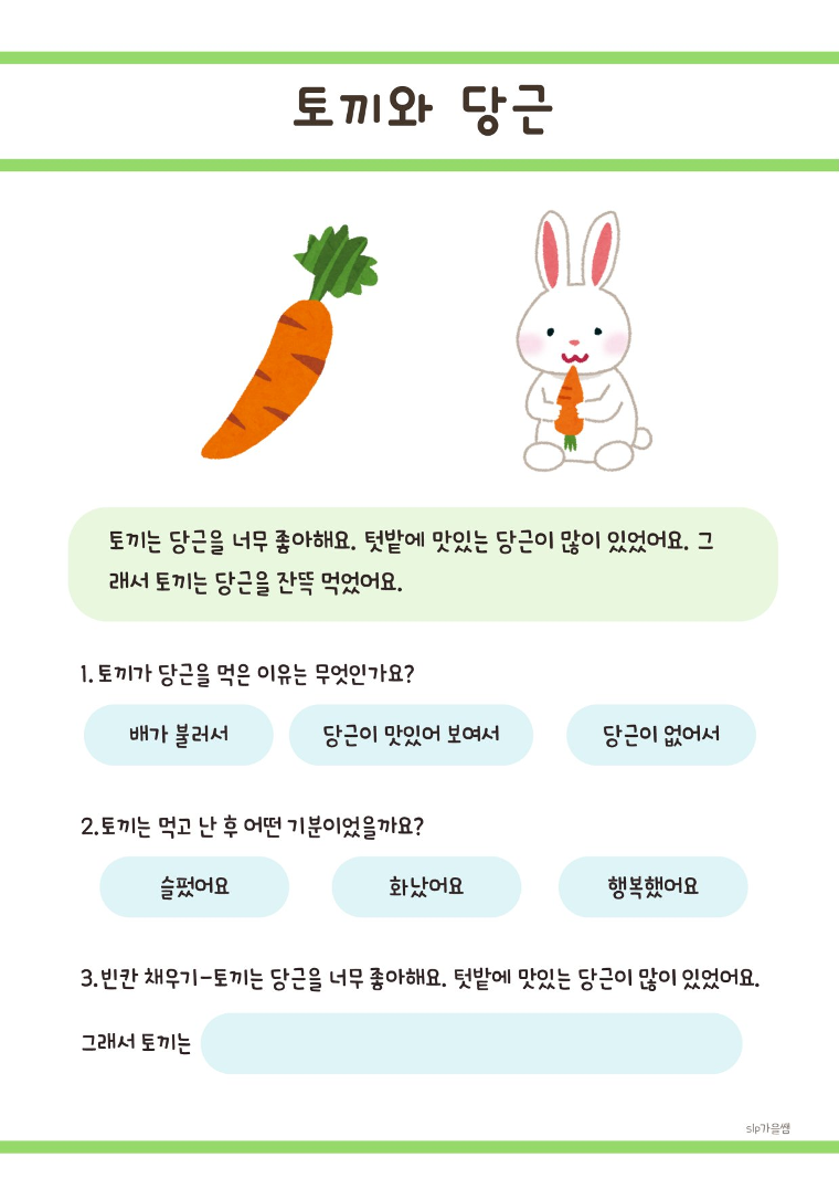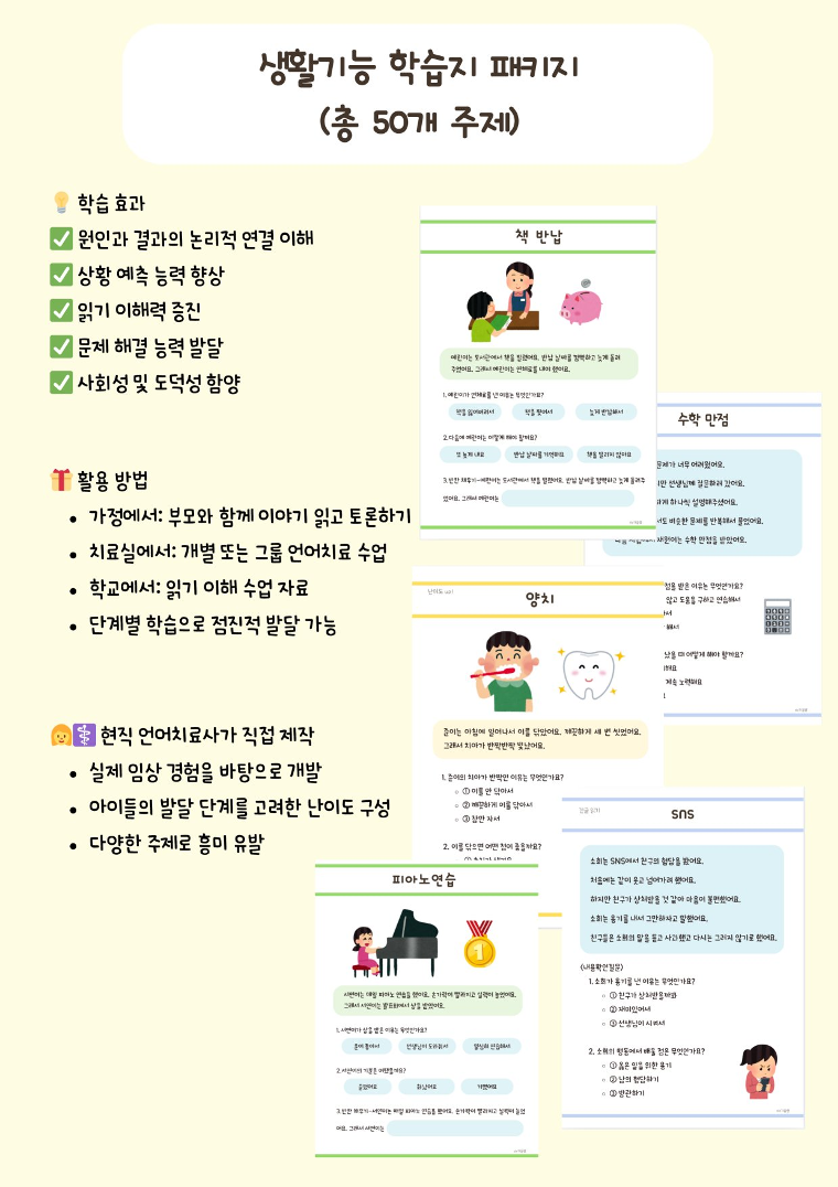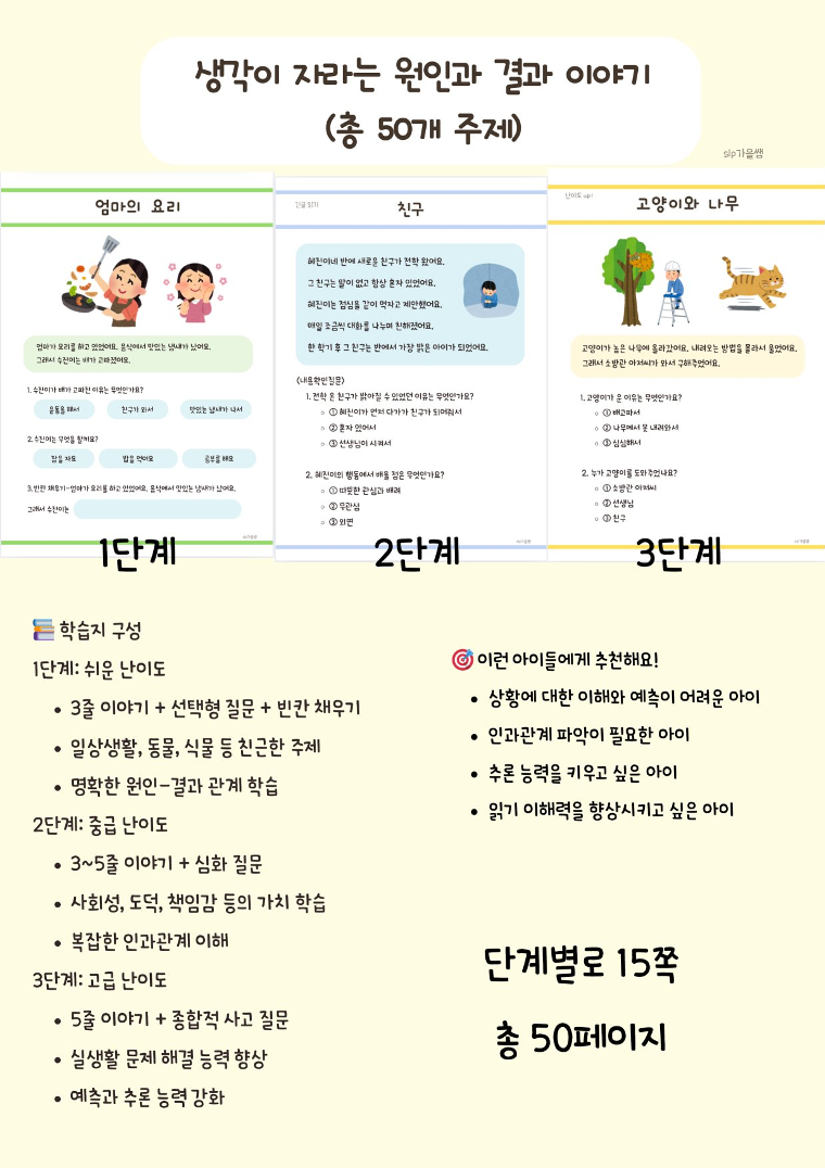 총 50페이지 입니다. ✨ 아이들의 논리적 사고력을 키워주는 원인과 결과 학습지 ✨ 🎯 이런 아이들에게 추천해요! 상황에 대한 이해와 예측이 어려운 아이 인과관계 파악이 필요한 아이 추론 능력을 키우고 싶은 아이 읽기 이해력을 향상시키고 싶은 아이 📚 학습지 구성 1단계: 쉬운 난이도 3줄 이야기 + 선택형 질문 + 빈칸 채우기 일상생활, 동물, 식물 등 친근한 주제 명확한 원인-결과 관계 학습 2단계: 중급 난이도 3~5줄 이야기 + 심화 질문 사회성, 도덕, 책임감 등의 가치 학습 복잡한 인과관계 이해 3단계: 고급 난이도 5줄 이야기 + 종합적 사고 질문 실생활 문제 해결 능력 향상 예측과 추론 능력 강화 💡 학습 효과 ✅ 원인과 결과의 논리적 연결 이해 ✅ 상황 예측 능력 향상 ✅ 읽기 이해력 증진 ✅ 문제 해결 능력 발달 ✅ 사회성 및 도덕성 함양 🎁 활용 방법 가정에서: 부모와 함께 이야기 읽고 토론하기 치료실에서: 개별 또는 그룹 언어치료 수업 학교에서: 읽기 이해 수업 자료 단계별 학습으로 점진적 발달 가능 👩⚕️ 현직 언어치료사가 직접 제작한 전문 학습지 실제 임상 경험을 바탕으로 개발 아이들의 발달 단계를 고려한 난이도 구성 다양한 주제로 흥미 유발
