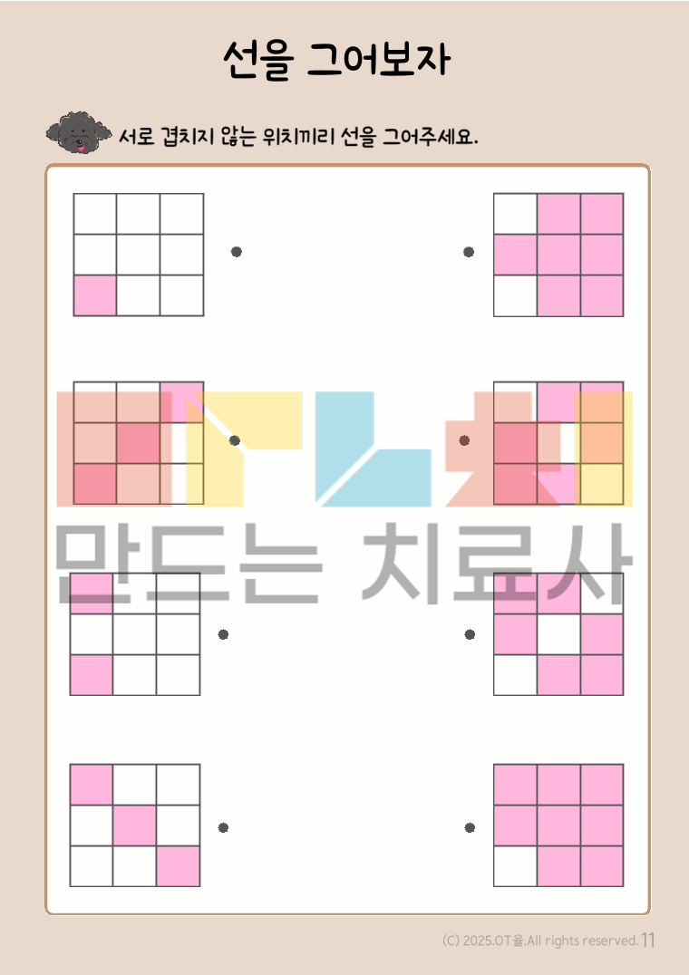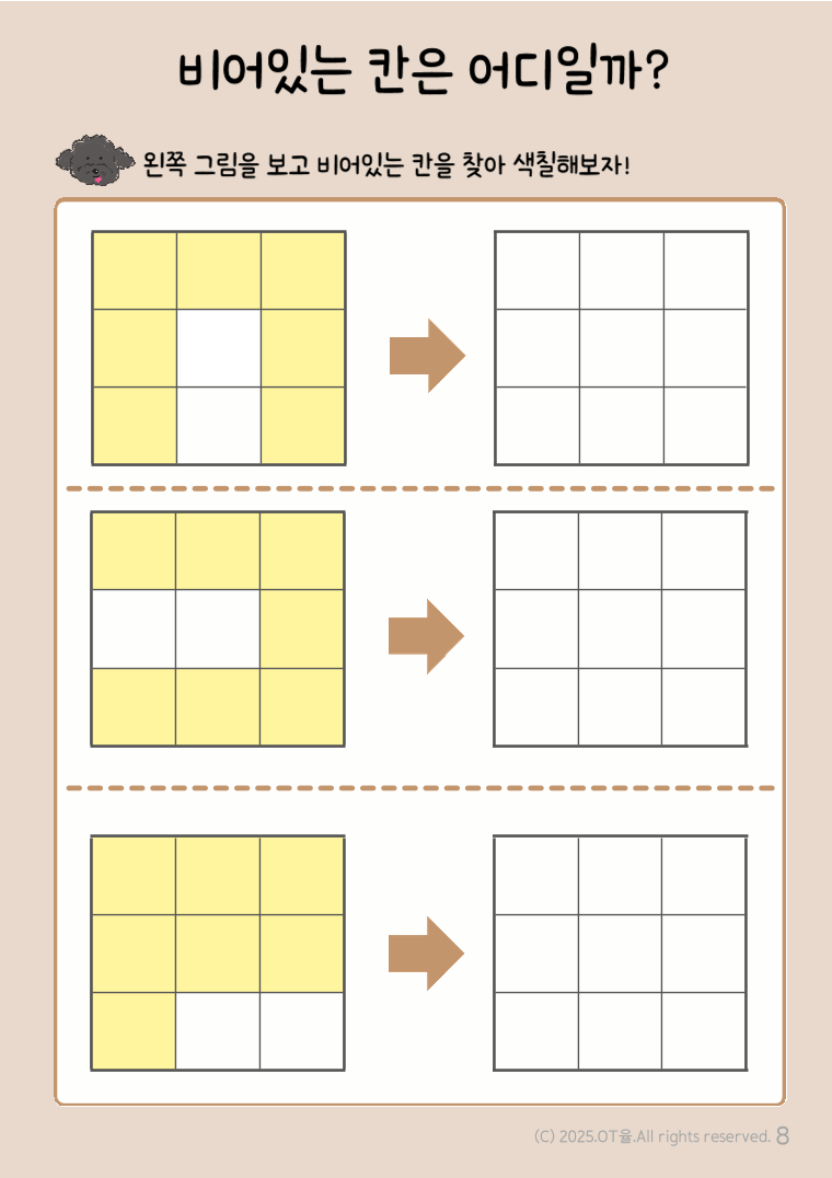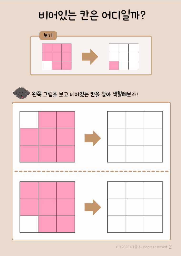 *구성 : 총 15p, PDF 파일 *설명 : - 그림을 보고 빈칸을 찾아 색칠하기 (1칸 ,2칸,3칸) - 서로 겹치지 않는 위치끼리 찾아 선 긋기 - 두 개의 그림을 합쳐 완성된 그림 찾아 선 긋기