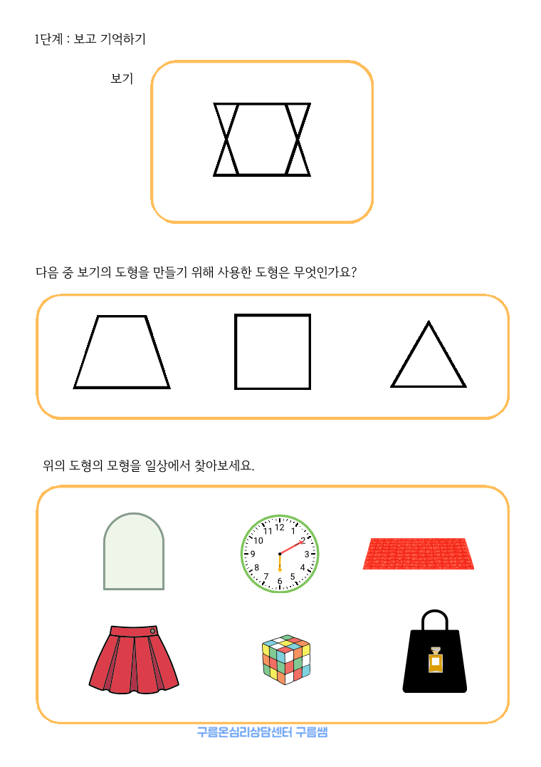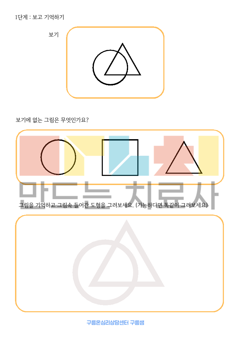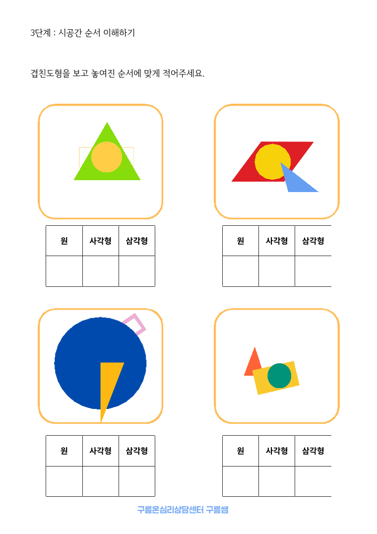 겹친 도형을 보고 순서 이해, 묘사, 등의 추론 활동을 진행합니다.