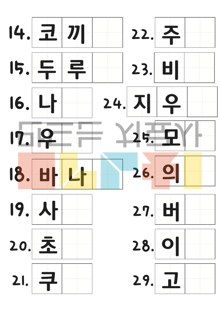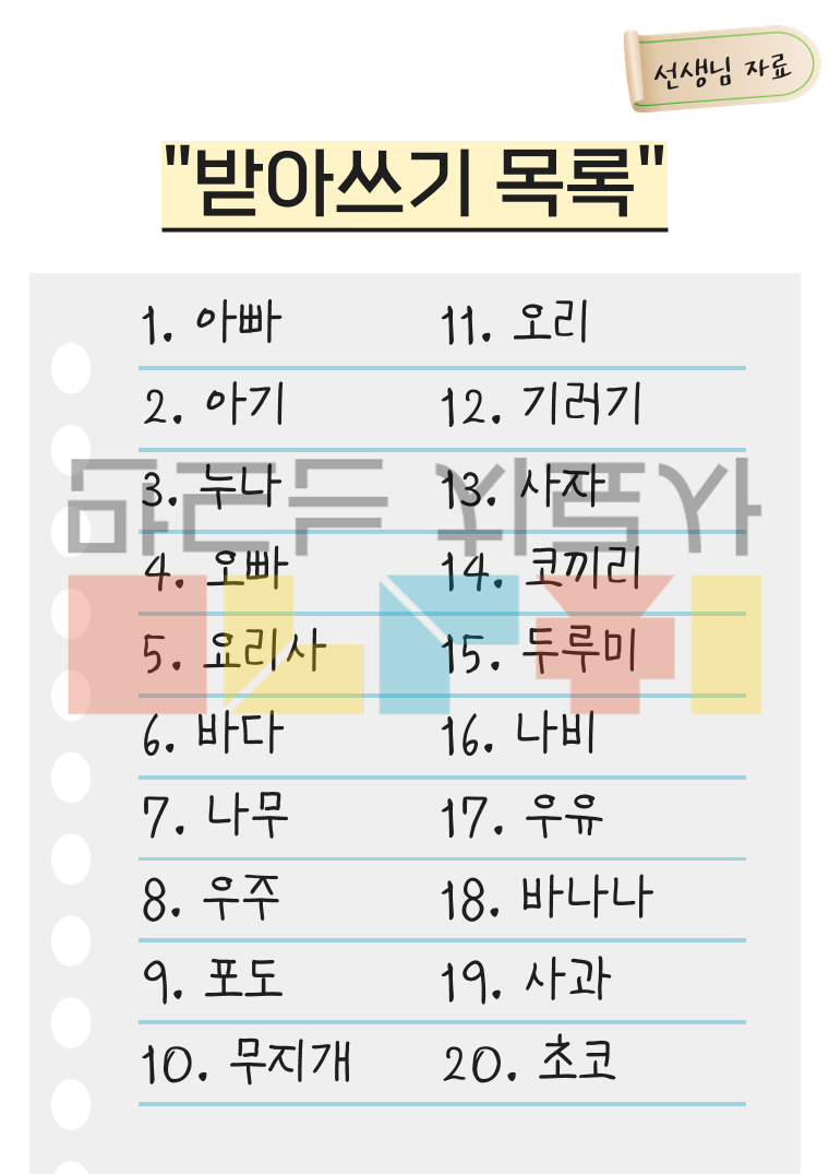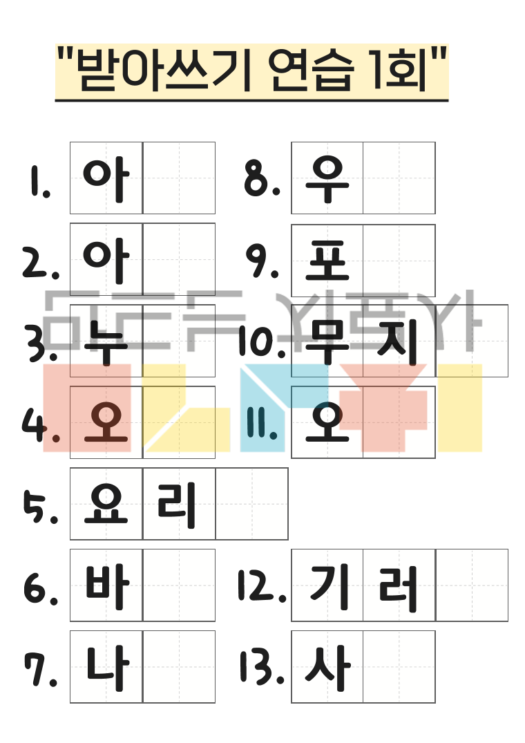 * 1급에서 8급까지의 받아쓰기 목록이 있으며 1학년 1학기 수준의 받아쓰기 입니다. *쉽게 받아쓰기 연습할 수 있도록 칸을 만들었습니다.