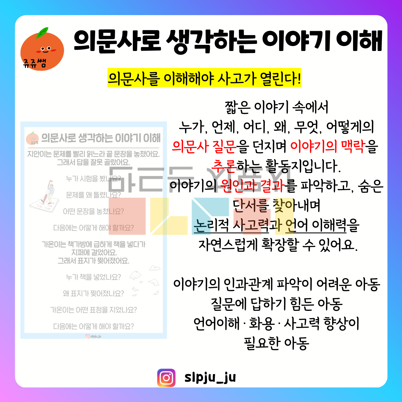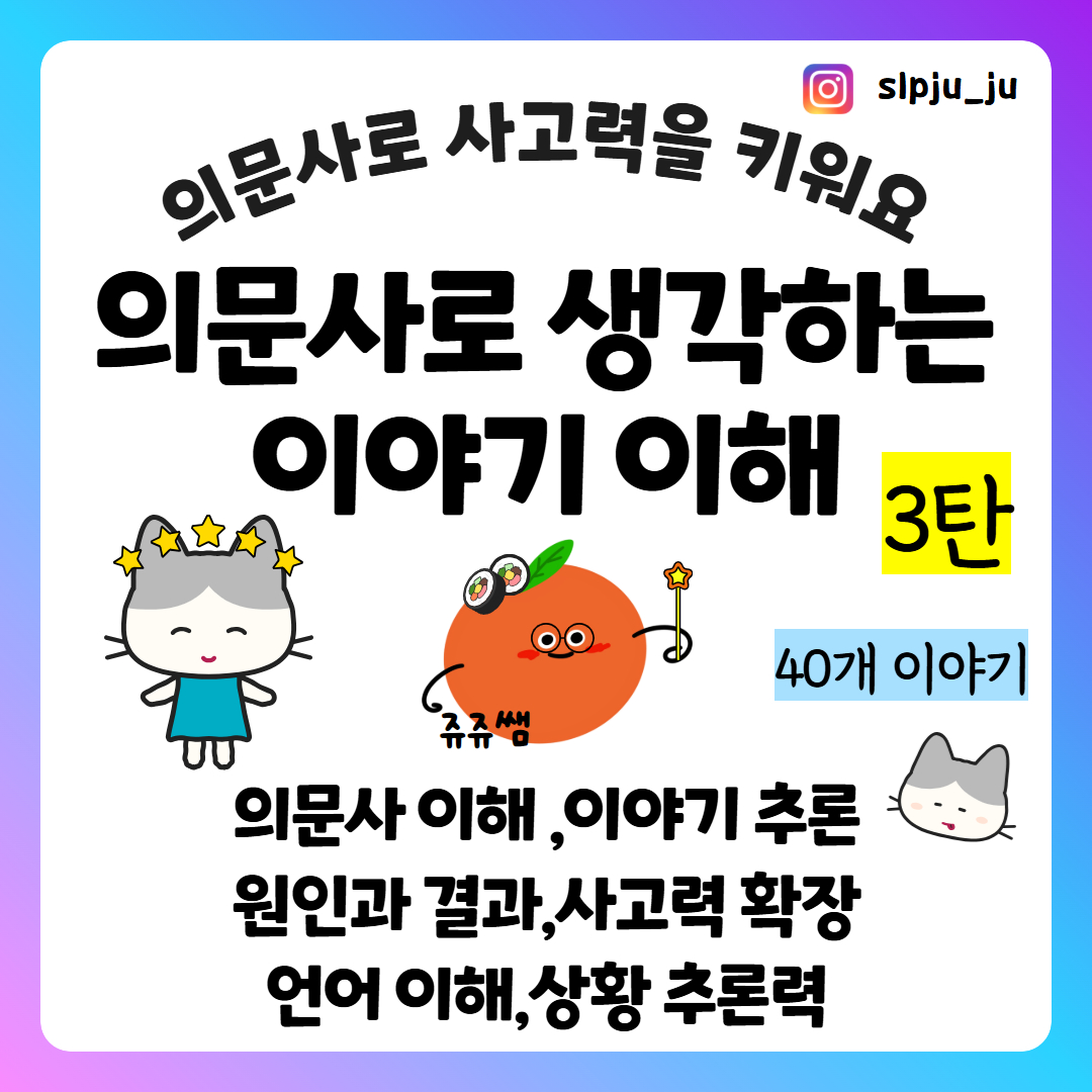 안녕하세요 쥬쥬쌤입니다. 의문사를 이해해야 사고가 열린다! 짧은 이야기 속에서 누가, 언제, 어디, 왜, 무엇, 어떻게의 의문사 질문을 던지며 이야기의 맥락을 추론하는 활동지입니다. 이야기의 원인과 결과를 파악하고, 숨은 단서를 찾아내며 논리적 사고력과 언어 이해력을 자연스럽게 확장할 수 있어요. 이야기의 인과관계 파악이 어려운 아동 질문에 답하기 힘든 아동 언어이해·화용·사고력 향상이 필요한 아동