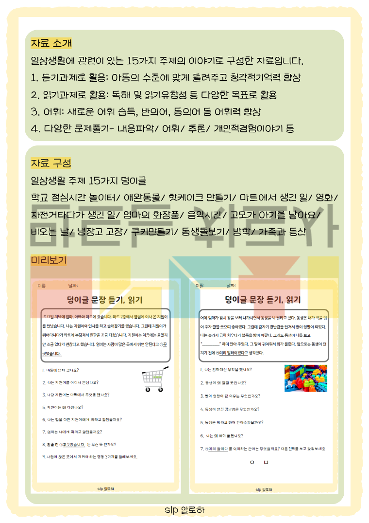 자료 소개 일상생활에 관련이 있는 15가지 주제의 이야기로 구성한 자료입니다. 1. 듣기과제로 활용: 아동의 수준에 맞게 들려주고 청각적기억력 향상(듣기 목표어휘확인/ 문장따라말하기/ 의문사질문 등) 2. 읽기과제로 활용: 독해 및 읽기유창성 등 다양한 목표로 활용 3. 어휘: 새로운 어휘 습득, 반의어, 동의어 등 어휘력 향상 4. 다양한 문제풀기- 내용파악/ 어휘/ 추론/ 개인적경험이야기 등 자료 구성 일상생활 주제 15가지 덩이글 학교 점심시간 놀이터/ 애완동물/ 핫케이크 만들기/ 마트에서 생긴 일/ 영화/ 자전거타다가 생긴 일/ 엄마의 화장품/ 음악시간/ 고모가 아기를 낳아요/ 비오는 날/ 냉장고 고장/ 쿠키만들기/ 동생돌보기/ 방학/ 가족과 등산