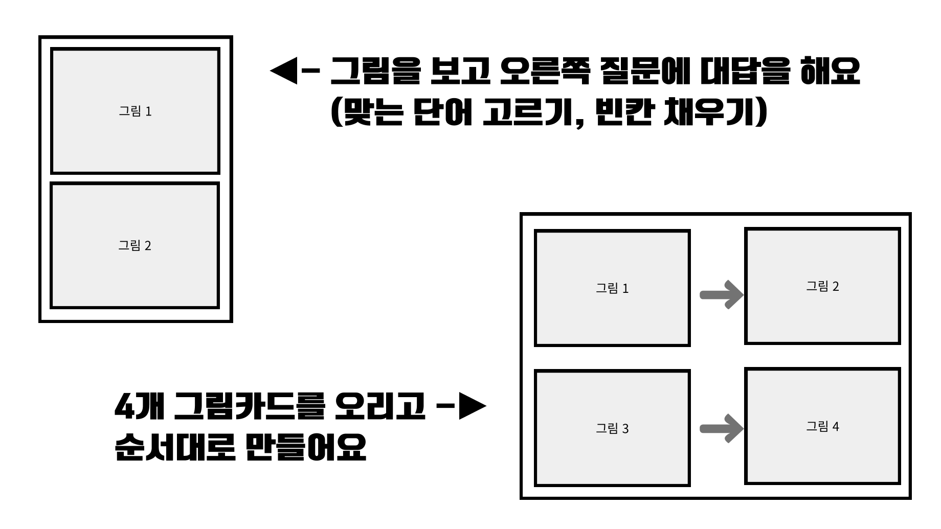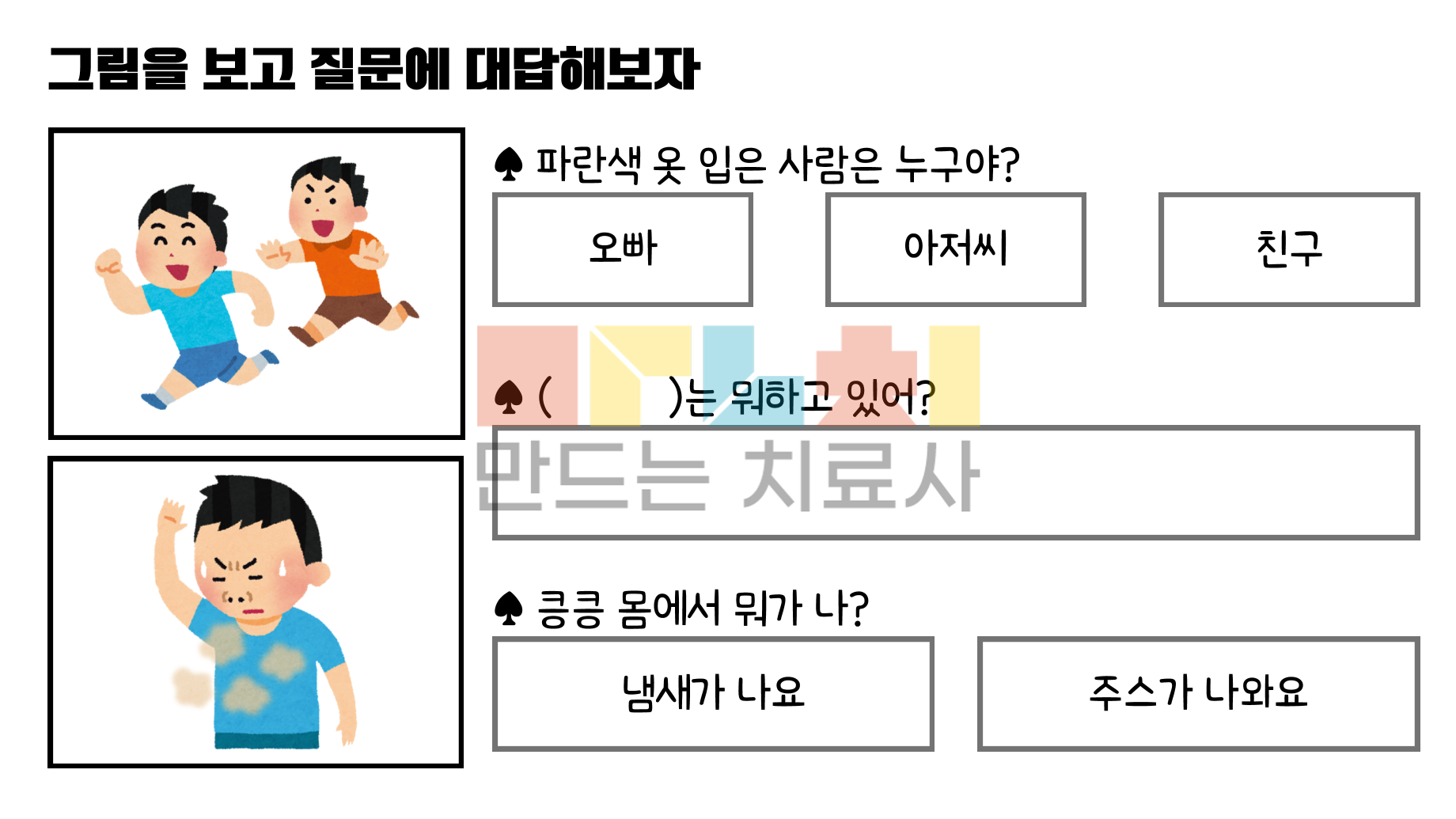 다음과 같은 목표로 제작한 활동지입니다. 1) 그림을 보고 의문사 질문에 대답하기 2) 순서대로 말하기 (원인-결과) 총 4가지의 이야기로 구성되어 있습니다. (한 가지 이야기에 4컷으로 구성)