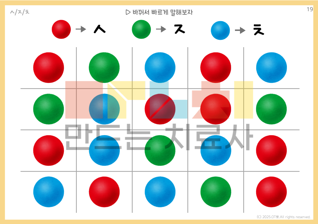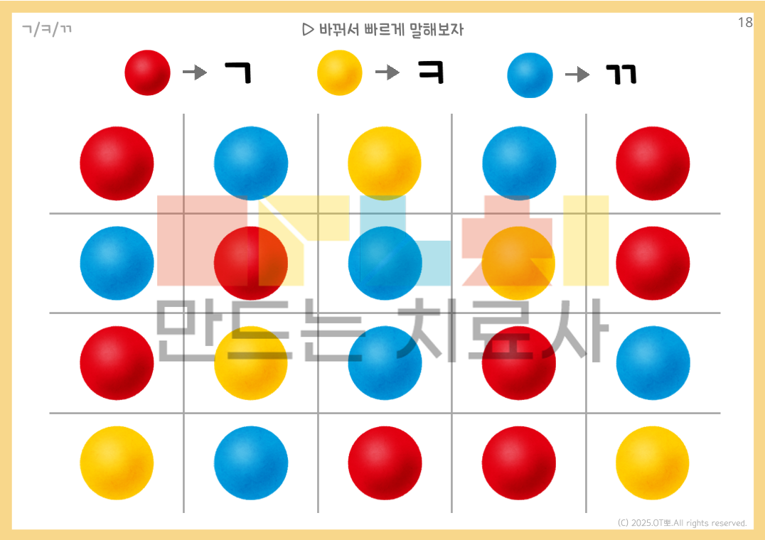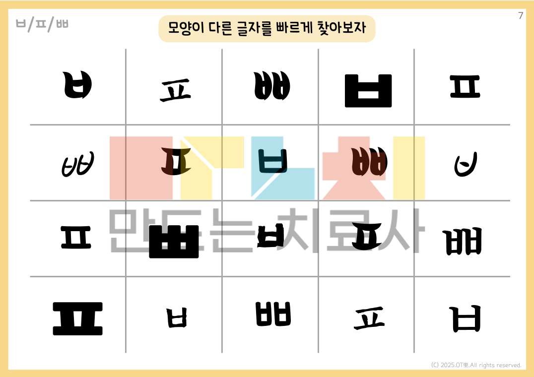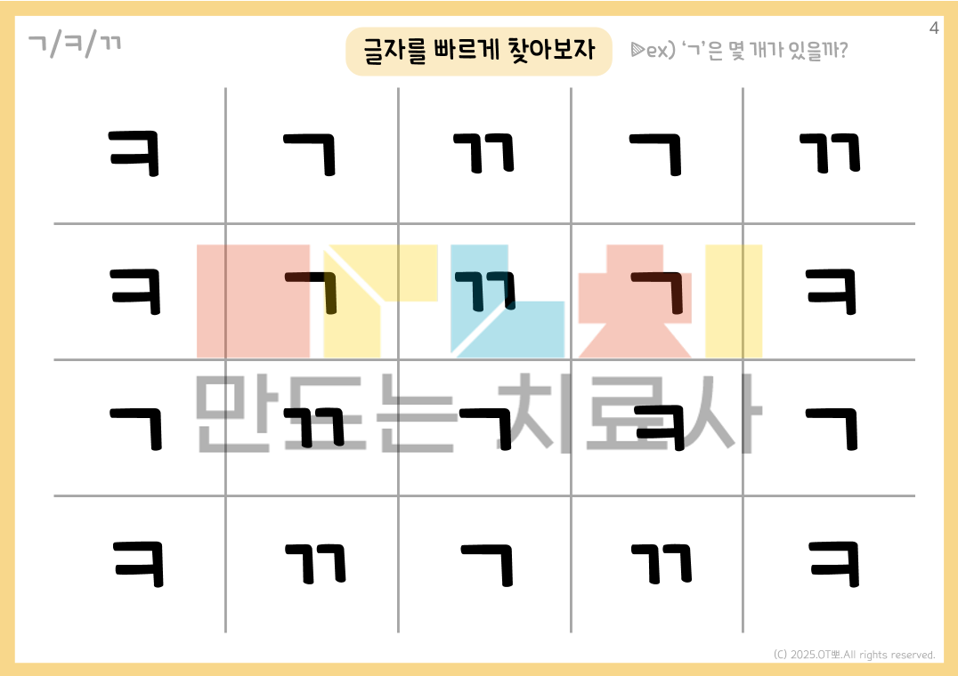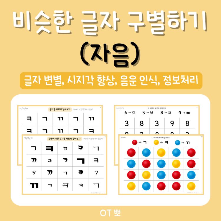 *자료 구성 : 총 22p / PDF 파일 *자료 설명 :자음 학습을 위한 시각적 변별 훈련 자료입니다 :글자 변별, 시지각 향상, 음운 인식 등을 목표로 제작 : ’ㄱ/ㅋ/ㄲ‘, 'ㄱ/ㄴ', ’ㄷ/ㅌ/ㄸ‘, ’ㅂ/ㅍ/ㅃ‘, ’ㅅ/ㅆ‘ 등 형태의 차이를 인식하고, 유사한 글자들을 구별하기 :정보처리 능력 향상을 목표로도 활용하실 수 있습니다