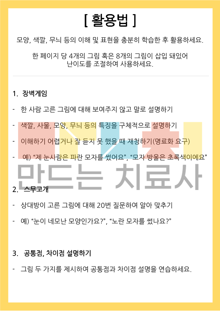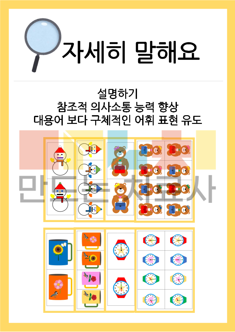설명하기 참조적 의사소통 능력 향상 대용어 보다 구체적인 어휘 표현 유도 => 장벽게임, 스무고개, 공통점과 차이점 설명하기 등의 활동으로 활용해보세요!