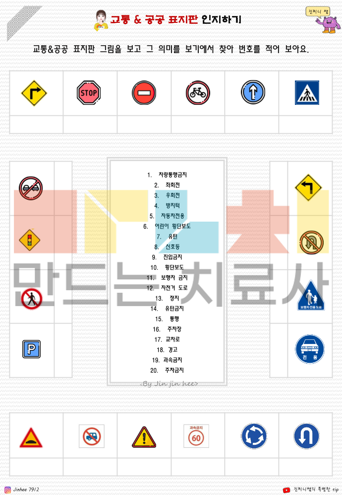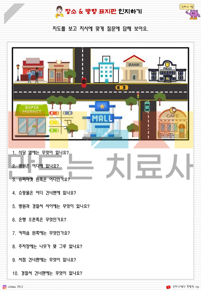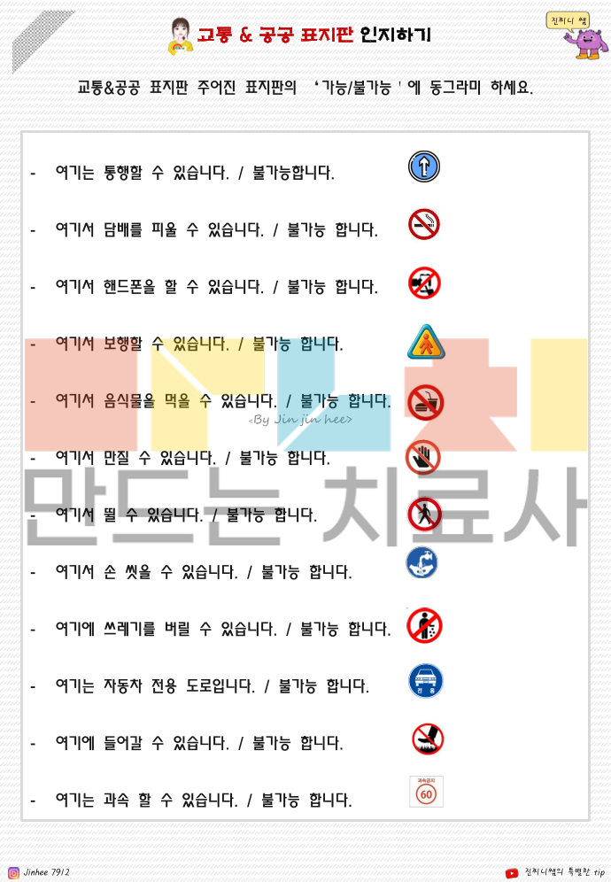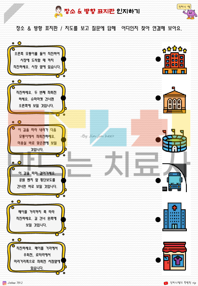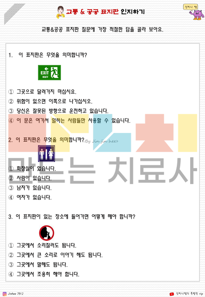 ✅ 1. 방향 개념 이해 (좌/우/앞/뒤/상/하) 화살표(→, ←, ↑, ↓) 변별 첫 번째 거리, 두 번째 거리 등 순서 개념 직진·좌회전·우회전 등 길 안내 표현 이해 ➡ 길 찾기, 이동 동선 이해의 기초 능력을 볼 수 있음. ✅ 2. 시지각 변별 능력 비슷한 표지판 구분 (정지/일방통행/진입금지 등) 색·모양·배치 변별 보기 중 맞는 그림 찾기, 단어-그림 매칭 ➡ 시각적으로 많은 정보 중 필요한 것만 골라내는 능력을 평가할 수 있음. ✅ 3. 주의력·집중력 여러 표지판 중 정확한 것 선택 ‘가능/불가능’ 동그라미 표시 지도 보며 경로 찾기 ➡ 주의 집중 지속 여부, 오류 빈도, 지시 수행 정확도 확인 가능. ✅ 4. 언어 이해 및 추론 능력 “이 표지판은 무엇을 의미합니까?” 객관식 문제 장소 찾기 질문 표지판 의미를 문장으로 완성하기 ‘~하면 안 됩니다’ vs ‘할 수 있습니다’ 구분 ➡ 표지판을 단순히 보는 것을 넘어 상황을 언어적으로 해석하고 의미를 추론하는 능력을 알아볼 수 있음. ✅ 5. 공간 지각력·지도 해석 능력 지도를 보고 “어디에 있나요?” 찾기 “건너편”, “맞은편”, “사이에”, “옆에” 등 위치 표현 이해 8방향 나침반(북/남/동/서, 북동 등) 사용 ➡ 생활 자립에 필수적인 공간 개념과 지도 읽기 능력 파악 가능. ✅ 6. 실생활 문제 해결 능력 “화장실을 찾으려면 어떤 표지판을 봐야 할까요?” “박물관은 어디에 있나요?” “이곳에서는 무엇을 하면 안 되나요?” ➡ 실제 생활에서 상황을 판단하는 능력을 함께 확인할 수 있음. ✅ 7. 사회적 규칙 이해 금연·금지·주의 표지판 어린이 보호구역 접근 금지, 입장 불가 등 사회적 규칙 ➡ 사회적 안전 규칙, 공공장소 규칙 준수 능력 평가 가능. ✅ 8. 자조기술(자립기술)로의 직접적인 확장 교재는 단순 학습에 그치지 않고, 아동이 실제로 길 찾기 대중교통 이용 안전한 이동 건물 내부에서 필요한 시설 찾기 금지사항 판단 이런 생활 자립 영역에 연결되도록 구성되어 있음. ➡ 발달장애 아동의 생활 적응력 향상에 매우 효과적인 교재라는 점을 알 수 있음.