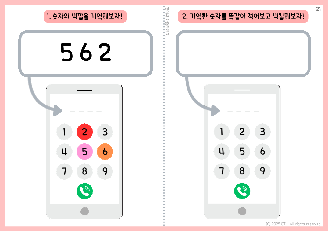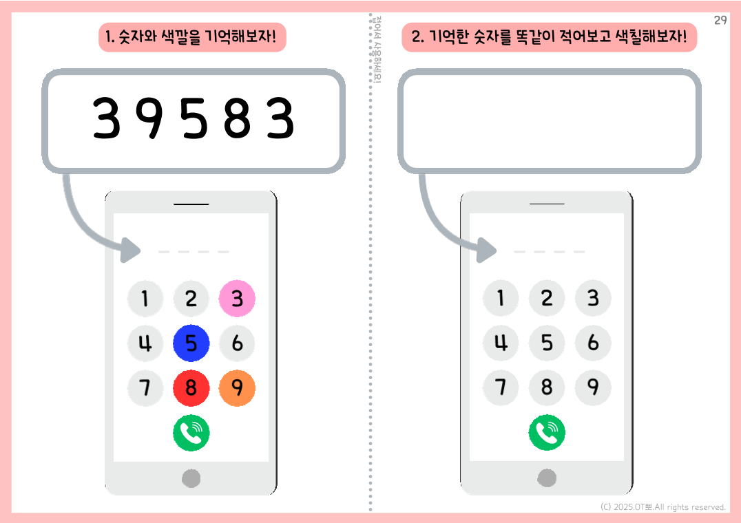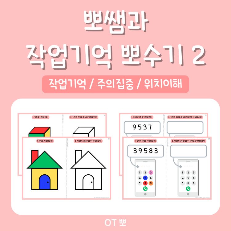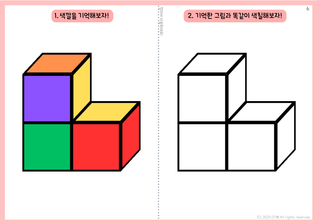 *자료 구성 : 총 32p / PDF 파일 *자료 설명 :작업기억/ 주의집중/ 위치이해 향상 :색깔과 그림을 기억, 숫자와 색깔을 조합하여 기억하는 훈련을 통해 인지 능력을 향상시키는 데 목표로 제작되었습니다