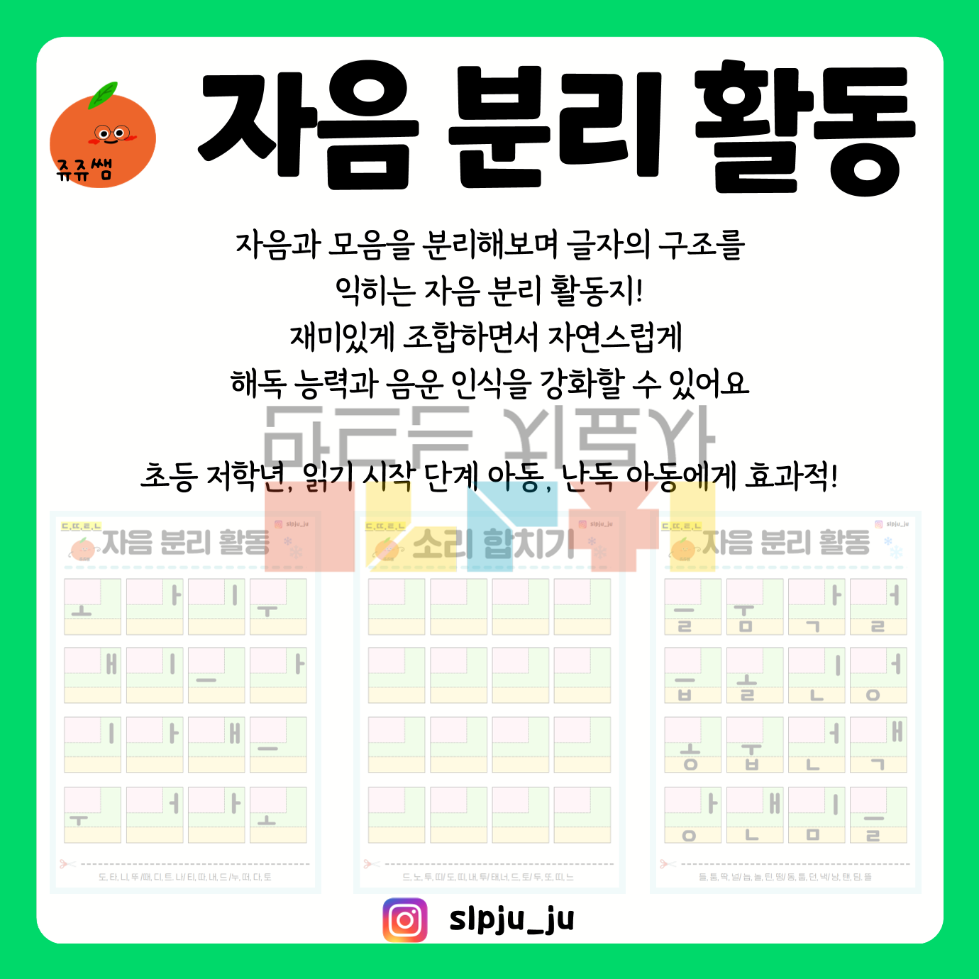 안녕하세요 쥬쥬쌤입니다. 자음과 모음을 분리해보며 글자의 구조를 익히는 자음 분리 활동지! 재미있게 조합하면서 자연스럽게 해독 능력과 음운 인식을 강화할 수 있어요 초등 저학년, 읽기 시작 단계 아동, 난독 아동에게 효과적!