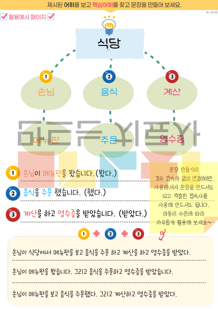 🎀 자 료 소 개 🎀 이 워크북은 학령기 경계선 지능 및 경도 지적장애 아동에게 자주 나타나는 어휘 연상 어려움, 단어 인출 지연, 문장 구성의 불안정성을 개선하기 위한 학습 자료입니다. 제시된 단어에서 핵심어를 찾고, 그 핵심어와 관련된 어휘를 활용해 자연스럽게 이어지는 문장을 구성하도록 설계되어 아동의 어휘 접근성, 의미 범주 확장, 표현 조직화 능력, 문장 산출 안정성을 강화합니다. 또한 초성 힌트 연상 활동과 무초성 연상 활동 페이지를 통해 아동이 핵심어에서 하위어를 떠올리고, 초성 단서를 사용해 보고, 이후 단서를 점차 소거해 나가면서 단어 인출과 어휘 연상 능력을 단계적으로 강화하도록 구성하였습니다. 🔖자료 구성🔖 20가지 핵심 단어 : 40P 활용예시 : 1P(1번 문항만 첨부) 총 합 : 41P (PDF)