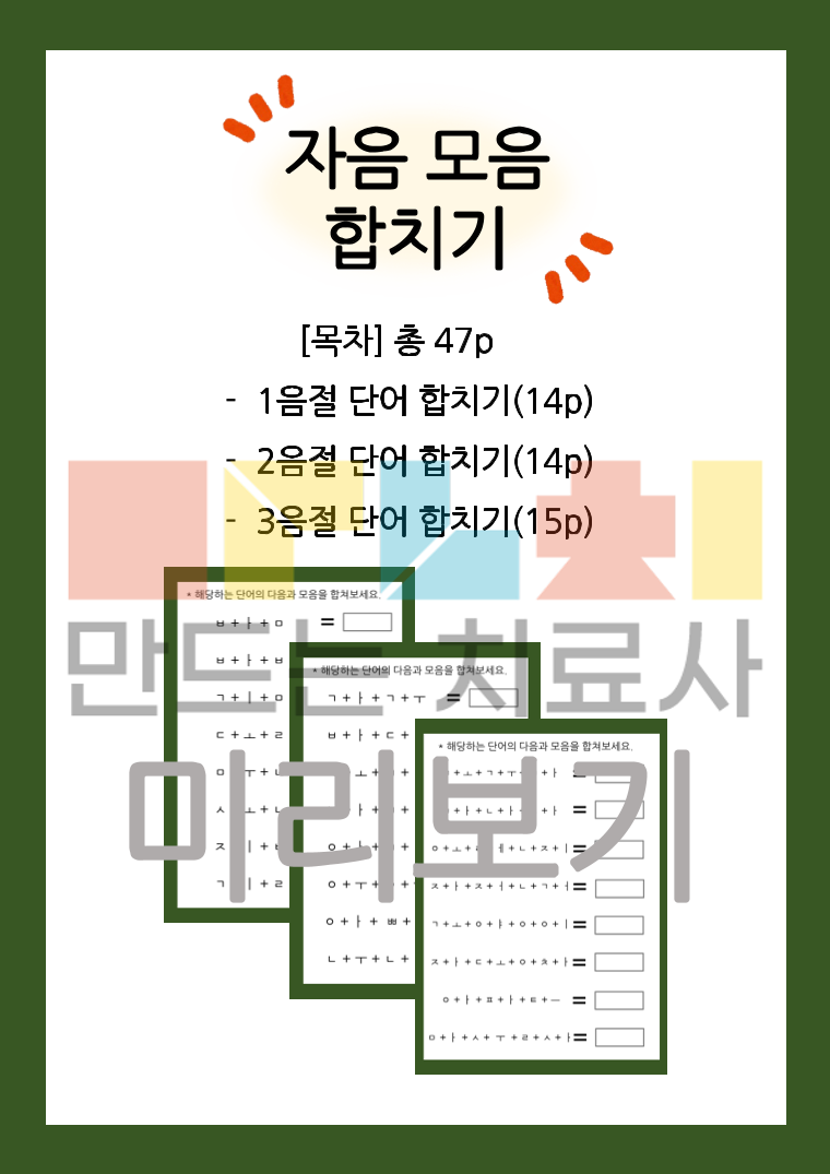 CVC 구조의 1음절 단어부터 3음절 단어까지! 음소를 합쳐 단어를 만들어 음운인식 및 읽기/쓰기 과제로 활용해보세요!