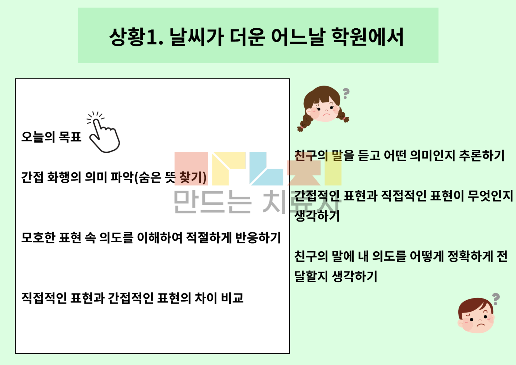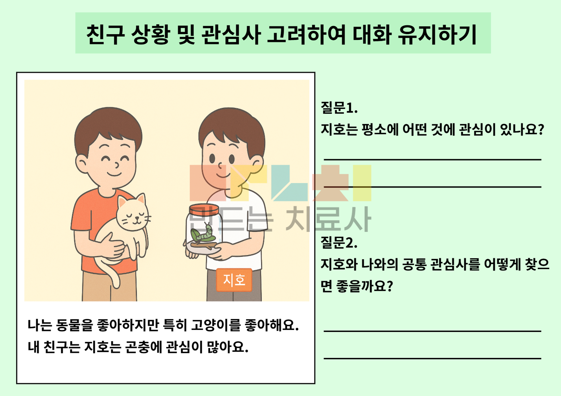 학령기 아동 화용언어 중재 관련 자료 입니다. 아동이 상황에 따라 간접 표현을 이해하여 문제해결력을 기르기 위한 자료입니다. 또한, 대화 시작 할 때 상대방의 관심사를 고려하여 대화 주고받기할 수 있도록 위한 자료입니다. 나와 상대방의 공통 관심사를 찾고 대화를 운용할 수 있도록 돕습니다.