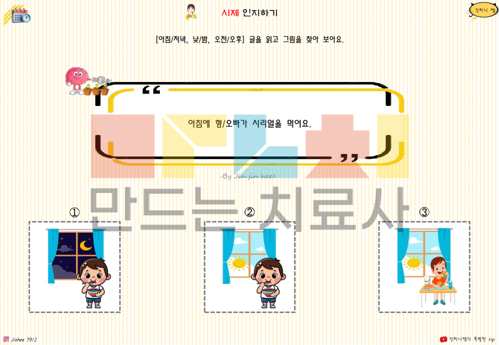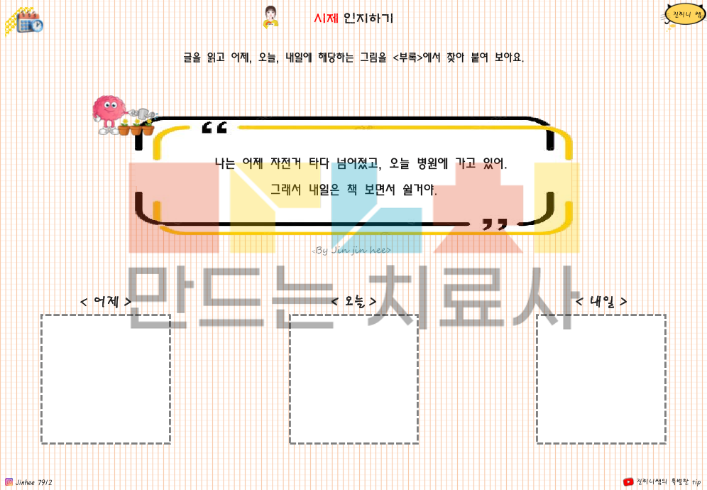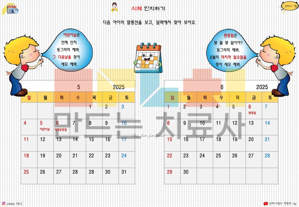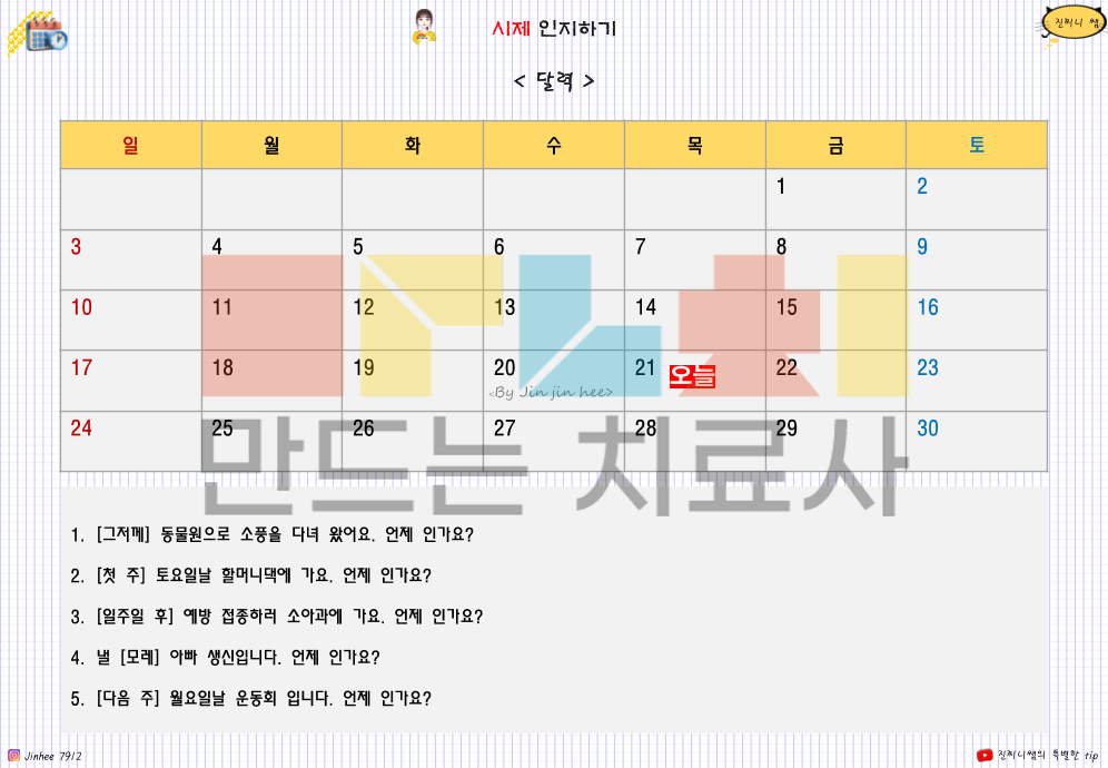 ① 시간·시제 개념 이해 심화 아동이 어제·오늘·내일, 아침·저녁, 주차 개념까지 시간의 흐름 전체를 구조적으로 이해하도록 돕습니다. ② 읽기·듣기 기반의 언어 이해력 강화 문장을 읽고 또는 듣고 → 시간 정보를 파악 → 맞는 그림·날짜를 선택하는 과정에서 수용언어·읽기 이해력이 함께 발달합니다. ③ 작업기억과 주의집중 능력 향상 시간 정보를 기억하고 유지해야 하므로 언어적 작업기억과 집중력 향상에 매우 효과적입니다. ④ 시지각·처리속도 발달 달력에서 날짜 찾기, 여러 이미지 중 상황 고르기 등은 시각적 탐색 능력, 처리속도, 정확성을 동시에 자극합니다. ⑤ 논리적 사고력(시간 순서) 발달 시간과 사건의 ‘전·후’, ‘이전·이후’ 관계를 자연스럽게 익히며 논리적 시간 개념을 구축하게 됩니다 <부록> 스티커 활용 할 수 있도록 기초 단계