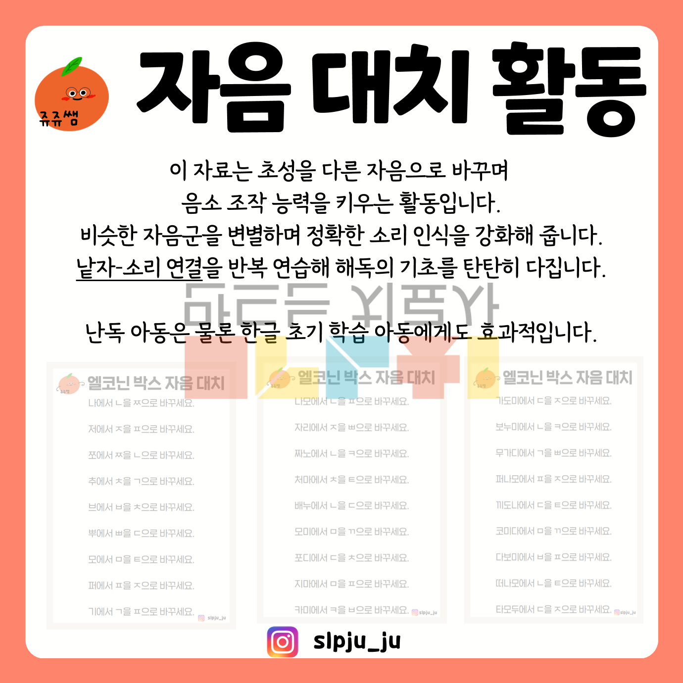 안녕하세요 쥬쥬쌤입니다. 이 자료는 초성을 다른 자음으로 바꾸며 음소 조작 능력을 키우는 활동입니다. 비슷한 자음군을 변별하며 정확한 소리 인식을 강화해 줍니다. 낱자–소리 연결을 반복 연습해 해독의 기초를 탄탄히 다집니다. 난독 아동은 물론 한글 초기 학습 아동에게도 효과적입니다.