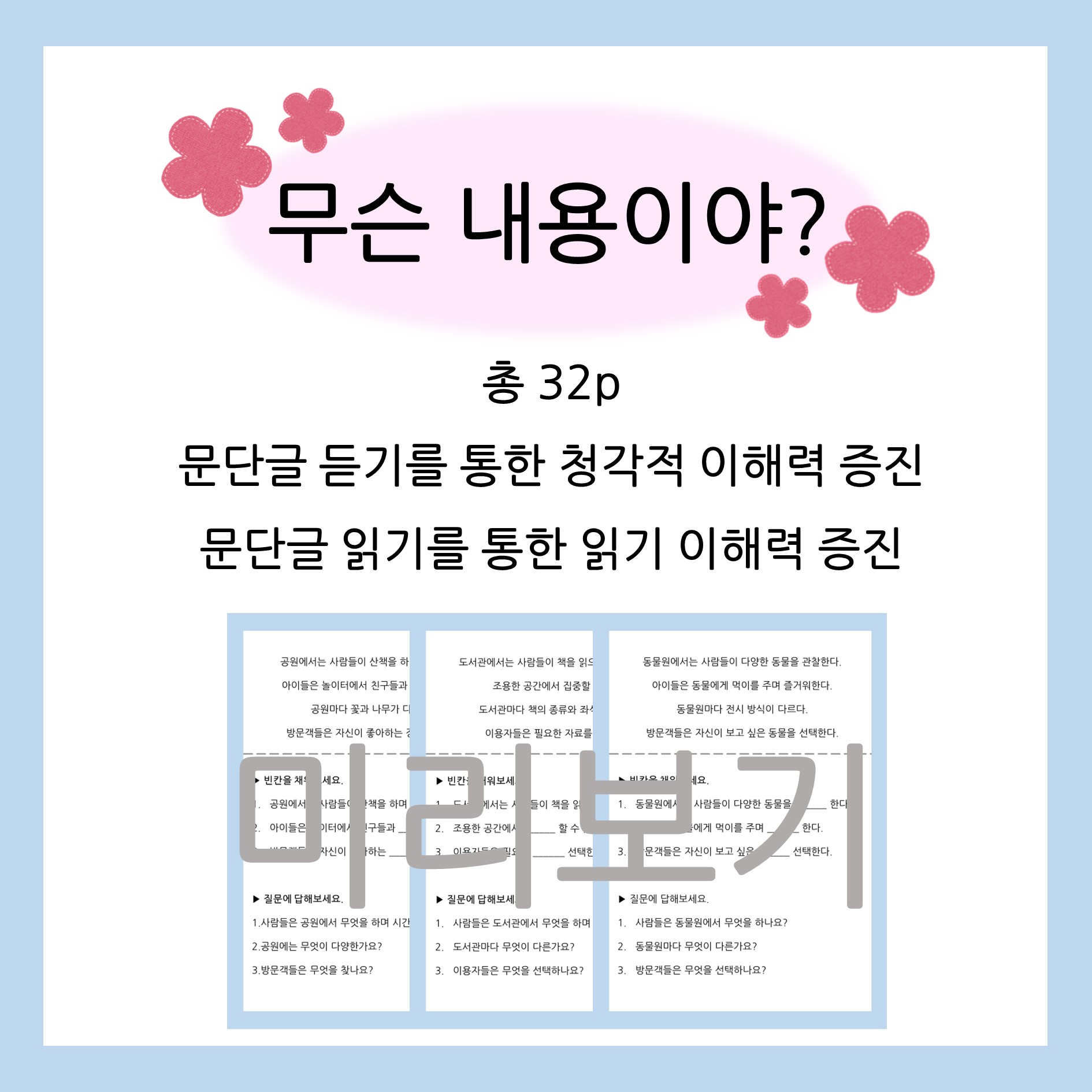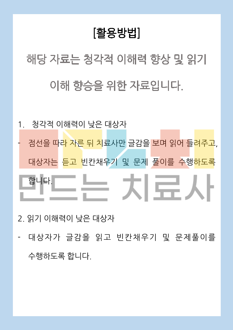 해당 자료는 청각적 이해력 향상 및 읽기 이해 향상을 위한 자료입니다. 청각적 이해력이 낮은 대상자 점선을 따라 자른 뒤 치료사만 글감을 보며 읽어 들려주고, 대상자는 듣고 빈칸채우기 및 문제 풀이를 수행하도록 합니다. 2. 읽기 이해력이 낮은 대상자 대상자가 글감을 읽고 빈칸채우기 및 문제풀이를 수행하도록 합니다.