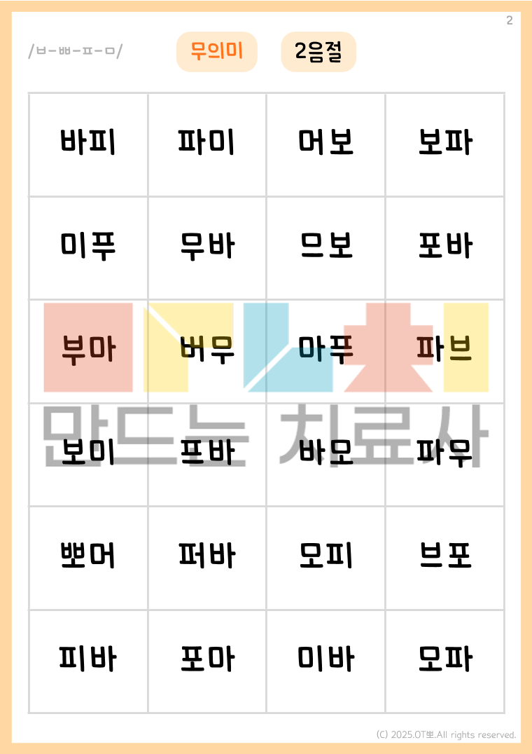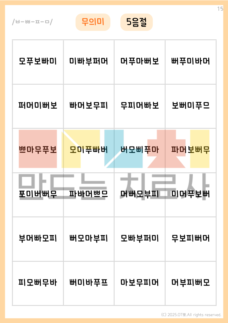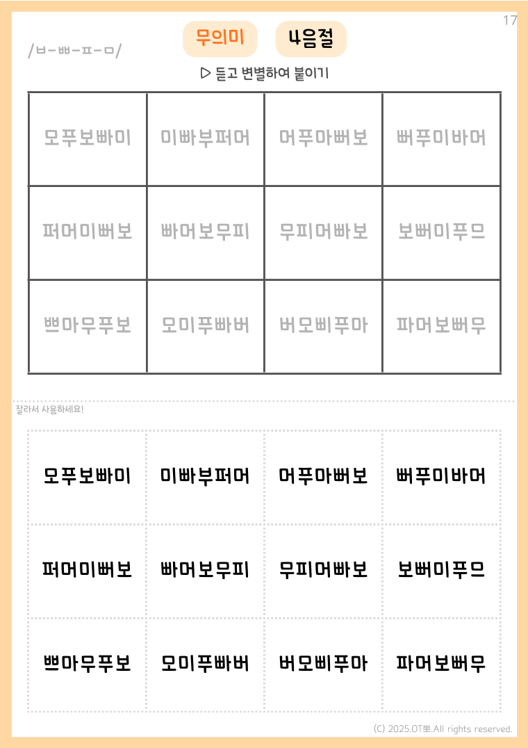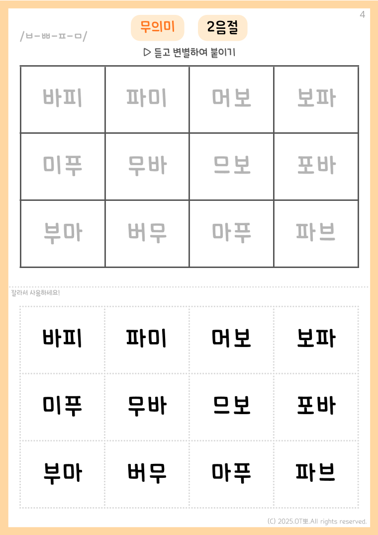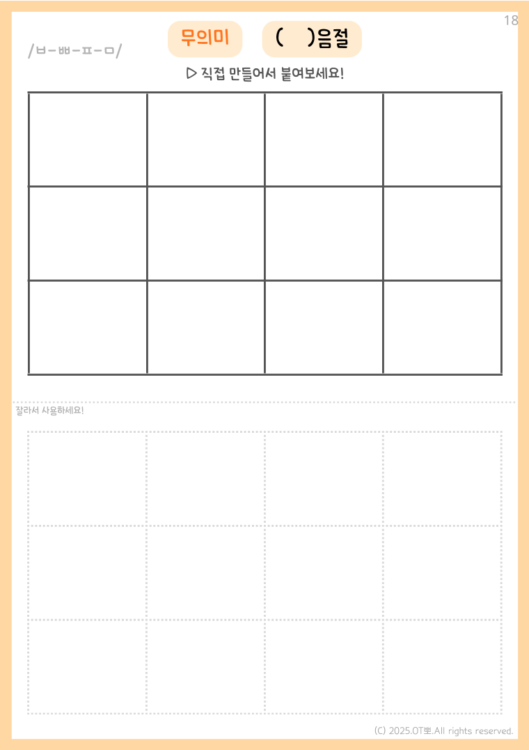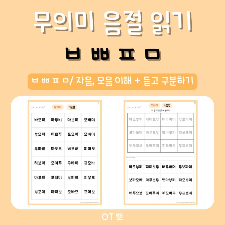 *자료 구성 : 총 18p / PDF 파일 *자료 설명 : (자음) ㅂ ㅃ ㅍ ㅁ & (모음) ㅏ ㅓ ㅗ ㅜ ㅡ ㅣ : 자음, 모음 이해하여 읽기 : 들려주는 음절 구분하여 붙이기 활동도 포함되어있습니다 : 난독아동에게 도움이 되는 초기 한글 학습 워크북입니다