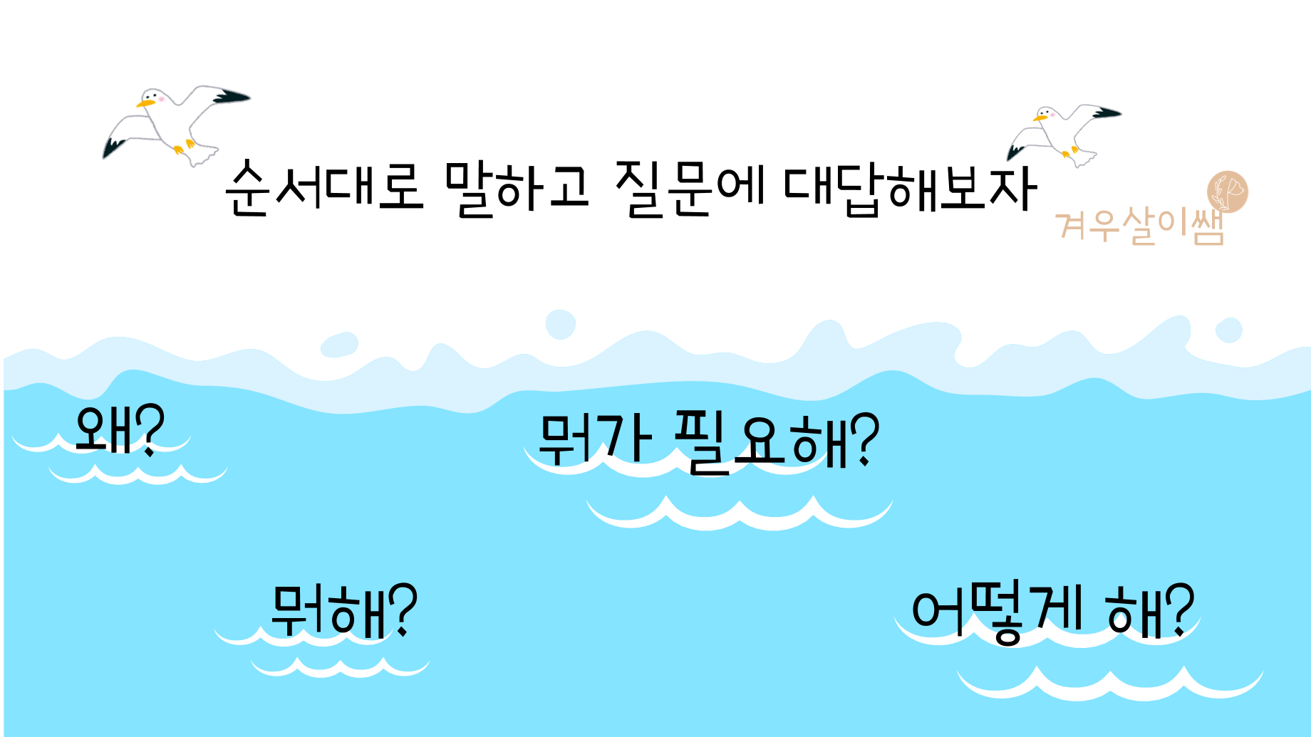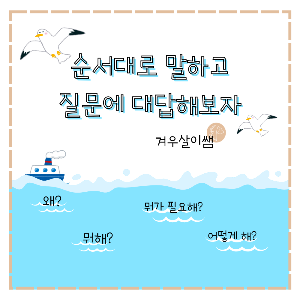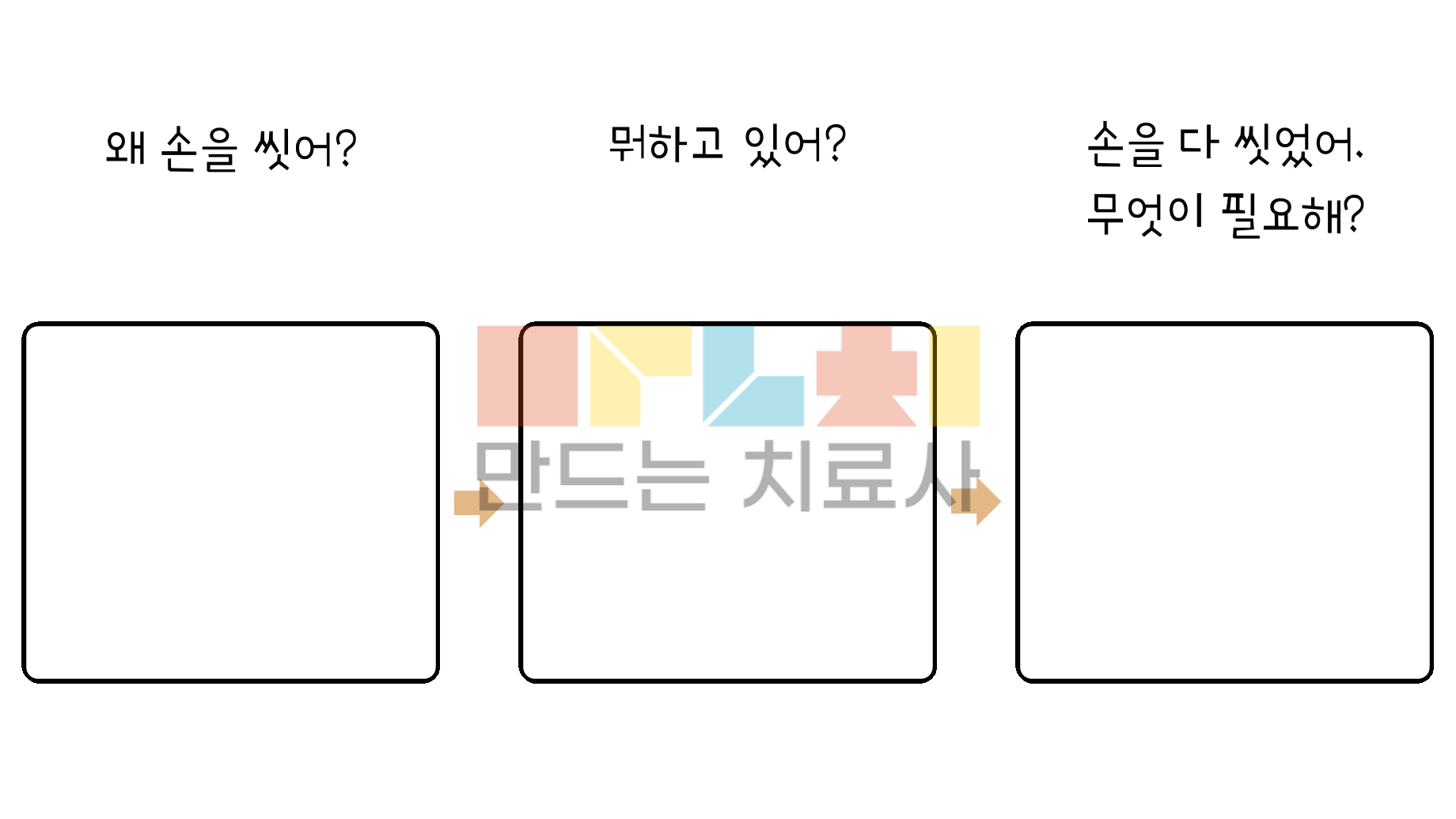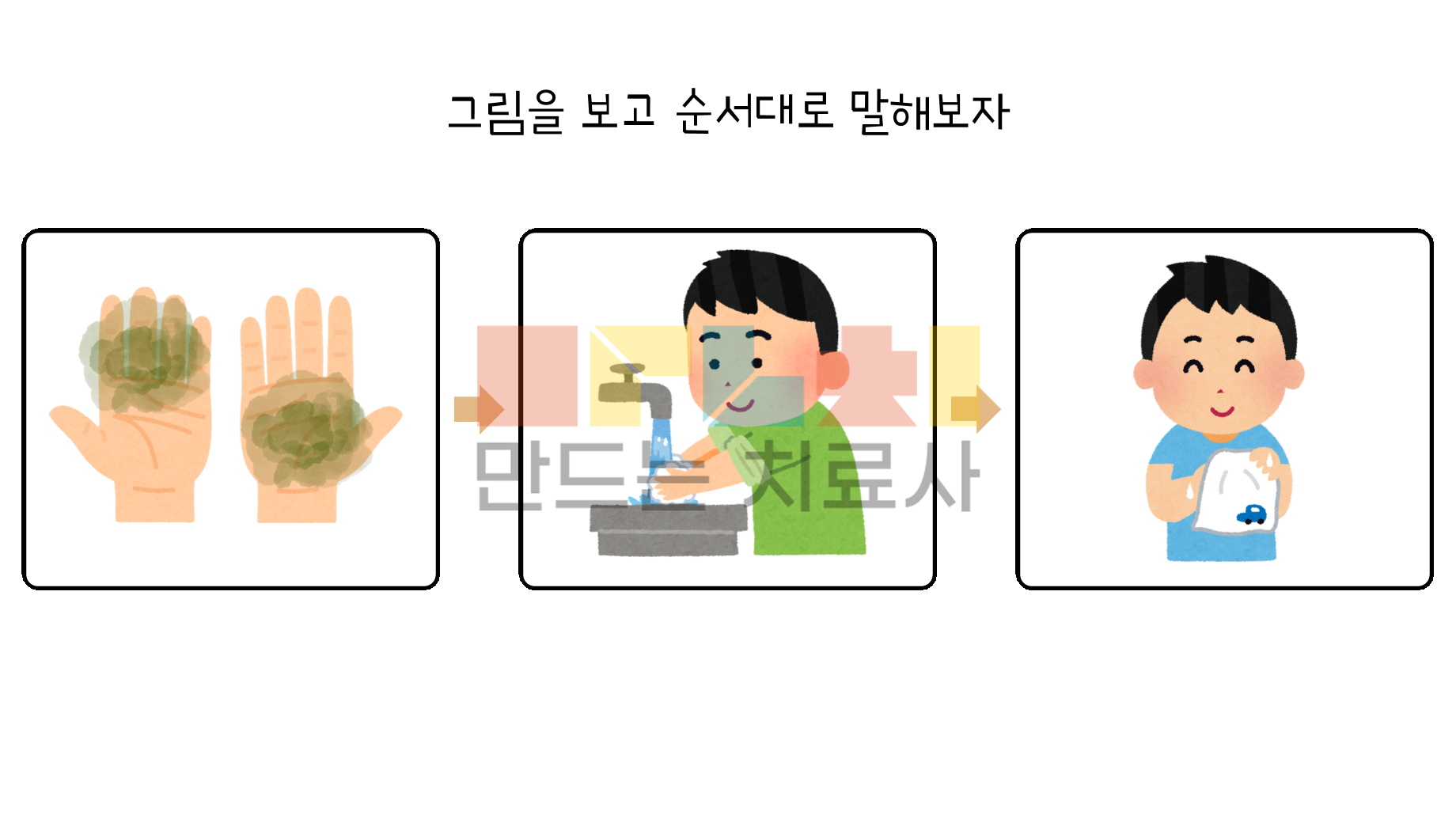 1) 순서대로 나열된 3개의 그림을 하나씩 보며 순서대로 말해요 2) 각 그림에 대해 잘라요. 3) 가운데 그림을 기준으로 좌/우로 나누어 질문에 대답해요