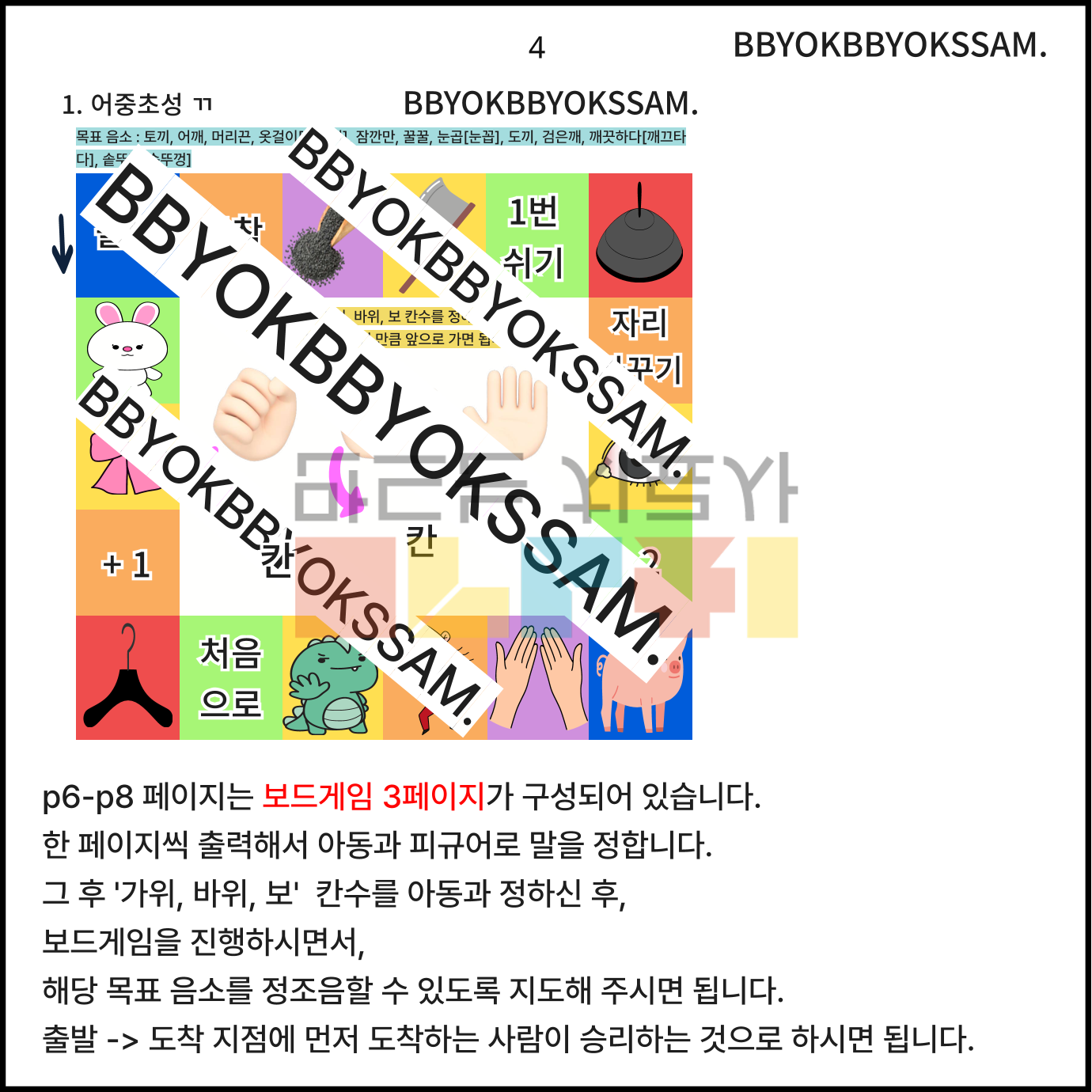 단어 수준에서 어중 초성 ㄲ를 정조음 하는 것을 목표로 제작하였습니다. 맨 앞에는 보드게임으로 3페이지 정도 들어 있고, 그 후 부터는 목표음소 5가지 중 색깔이 똑같은 것 2개 찾아서 2번씩 정조음을 목표로 지도해주시면 됩니다.
