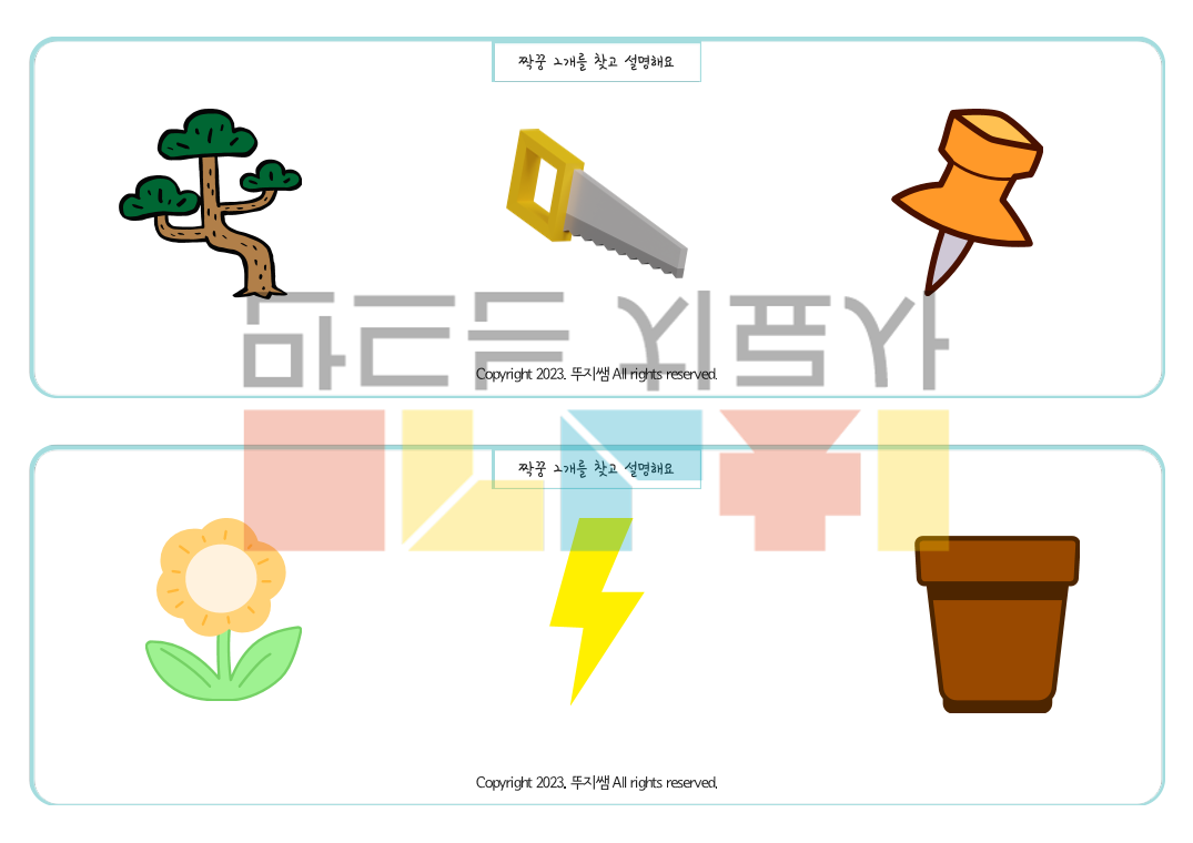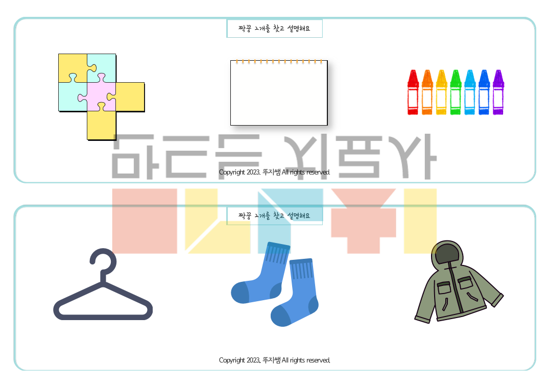 '나의 짝꿍은 어디 있을까?' 자료는 3가지의 그림 중에서 같이 쓰일 수 있는 2가지의 그림이나 연관이 있는 그림 2가지를 찾아보고 설명할 수 있도록 만든 자료 입니다 사물의 기능을 인지하고 언제 쓰이는 것인지 설명하기 활동을 할 수 있습니다 페이지수 : 10페이지 (20장의 카드형식)
