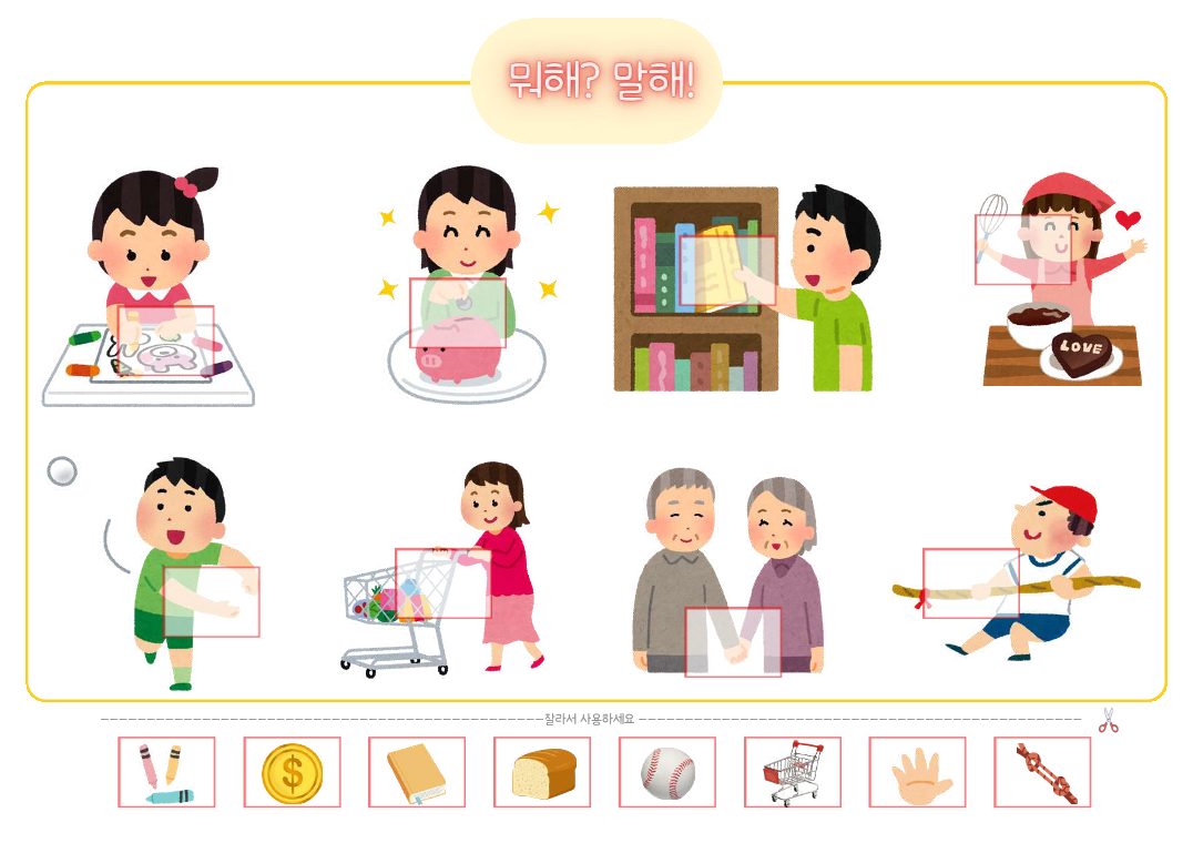 일상생활과 놀이 속에서 접하고 익혀야 할 기본 동사 어휘들로 구성되어 있습니다. 동사 카드를 통해서 기본 어휘를 습득한 다음에는 상황 장면 그림을 보고 문법적으로 보다 복잡한 문장으로 확장시켜 주세요!