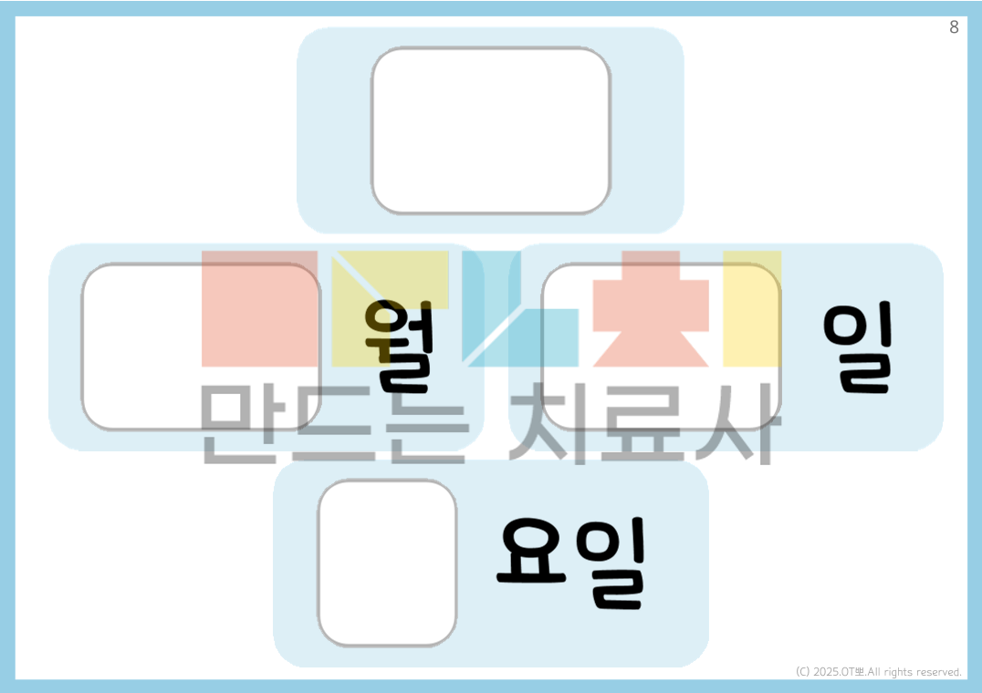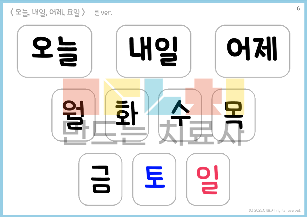 *자료 구성 :PDF파일 :총 13p *자료 설명 : 날짜 이해를 목표로 제작되었습니다 : 오늘, 내일, 어제/ 월/ 일/ 요일을 이해하며 붙이거나 적어서 활용할 수 있습니다.