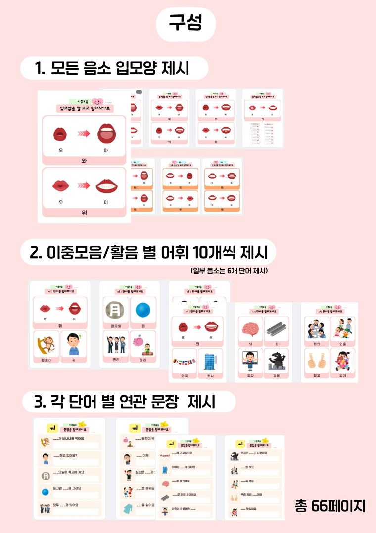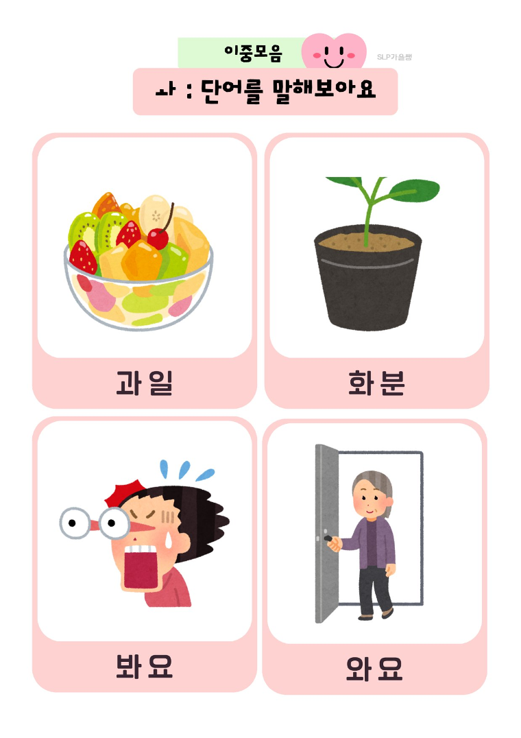이중모음 : ㅘ ㅟ ㅝ ㅙ ㅚ ㅞ ㅢ 활음: ㅑ ㅕ ㅛ ㅠ ㅖ ㅒ 📌 목표 각 이중모음의 단어와 문장을 90% 이상 바르게 말할 수 있다 이중모음 발음을 통해 구강운동을 유도하고 턱벌리기를 할 수 있다 👶 추천 대상 이중모음 익히기가 필요한 아동 발화 시 턱을 잘 움직이지 않는 아동 이중모음의 단모음화가 보이는 아동, 성인 단어에서 문장으로 확장 연습이 필요한 아동 💡 활용 TIP 먼저 단어카드로 발음 연습 문장 읽기로 자연스러운 발화 유도 빈칸 채우기로 어휘력 확인 가정 연계로 제공 가능 (drill play) #이중모음 #언어치료 #언어치료학습지 #이중모음레시피 #단어학습 #문장연습 #슬기로운언어치료생활 #slp가을샘 #언어재활사 #언어치료사 #조음음운치료