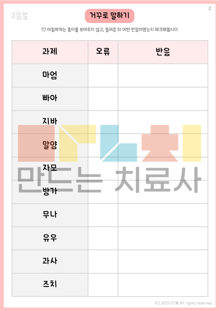 *자료 구성 : 총 11p / PDF 파일 *자료 설명 : 주의집중, 청각기억, 작업기억, 음운 인식 향상을 목표로 제작 되었습니다 : 2음절(4장)/ 3음절(3장)/ 4음절(2장)/ 자유롭게 활용할 수 있는 워크지(1장)