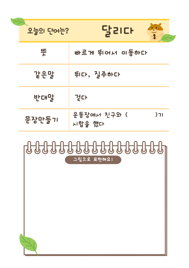 [언어치료사가 알려주는 효과적인 어휘 학습법] 안녕하세요, 가을쌤입니다☆ 오늘은 '동사 익힘표' 학습지를 소개하며, 왜 이런 구성이 필요한지 말씀드리려고 해요~ 🔍 어휘력, 4단계로 완성됩니다 많은 부모님들이 "단어 뜻만 알면 되는 거 아닌가요?"라고 물으세요. 하지만 언어치료 현장에서 보면, 뜻만 아는 아이들이 실제 대화에서는 그 단어를 못 쓰는 경우가 많습니다. 진짜 어휘력은 이 4가지가 모두 필요해요: ✅ 1단계: 뜻 이해하기 - 단어의 정확한 의미 파악 - 개념의 핵심 이해 ✅ 2단계: 같은말 배우기 - 유사 어휘 학습으로 표현력 확장 - "달리다 = 뛰다 = 질주하다"처럼 다양한 표현 익히기 ✅ 3단계: 반대말 알기 - 대조 개념 학습으로 의미 명확화 - 개념의 경계를 뚜렷하게 이해 ✅ 4단계: 문장 만들기 - 실생활 적용 능력 키우기 - '아는 단어'를 '쓸 수 있는 단어'로 전환 🎨 그리고 특별한 장치: 그림으로 표현하기 각 학습지마다 '그림으로 표현하기' 칸을 넣었어요. 이게 왜 중요할까요? 1. 능동적 학습 - 수동적 암기 → 능동적 상상 - 아이가 스스로 단어를 해석하고 표현 2. 시각적 기억 - 언어 정보 + 시각 이미지 통합 - 장기기억으로 전환되는 효과 ↑ 3. 창의적 사고 - "달리다"를 어떻게 그릴까? - 다리? 사람? 동물? → 사고 확장 4. 멀티모달 학습 - 읽기(시각) + 쓰기(운동) + 그리기(시각+운동) - 여러 감각을 활용한 통합 학습 📚 50개 핵심 동사로 구성 일상생활에서 꼭 필요한 동사 50개를 이 체계로 모두 학습할 수 있도록 만들었습니다. 언어치료 현장과 가정에서 모두 활용 가능한 자료예요. 우리 아이 어휘력, 이제 제대로 키워보세요! 💙 #언어치료 #어휘력 #학습지 #언어발달 #초등국어